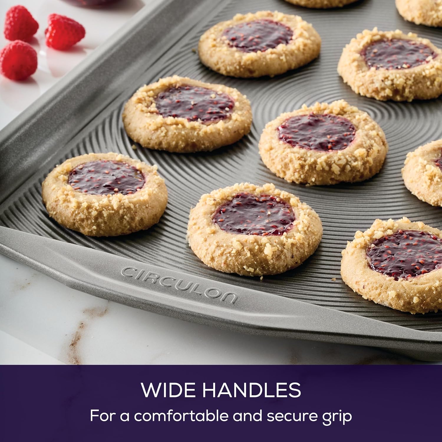 - Oven safe to 450 degrees Fahrenheit; wide handles on the cookie sheet provide generous, confident grip
