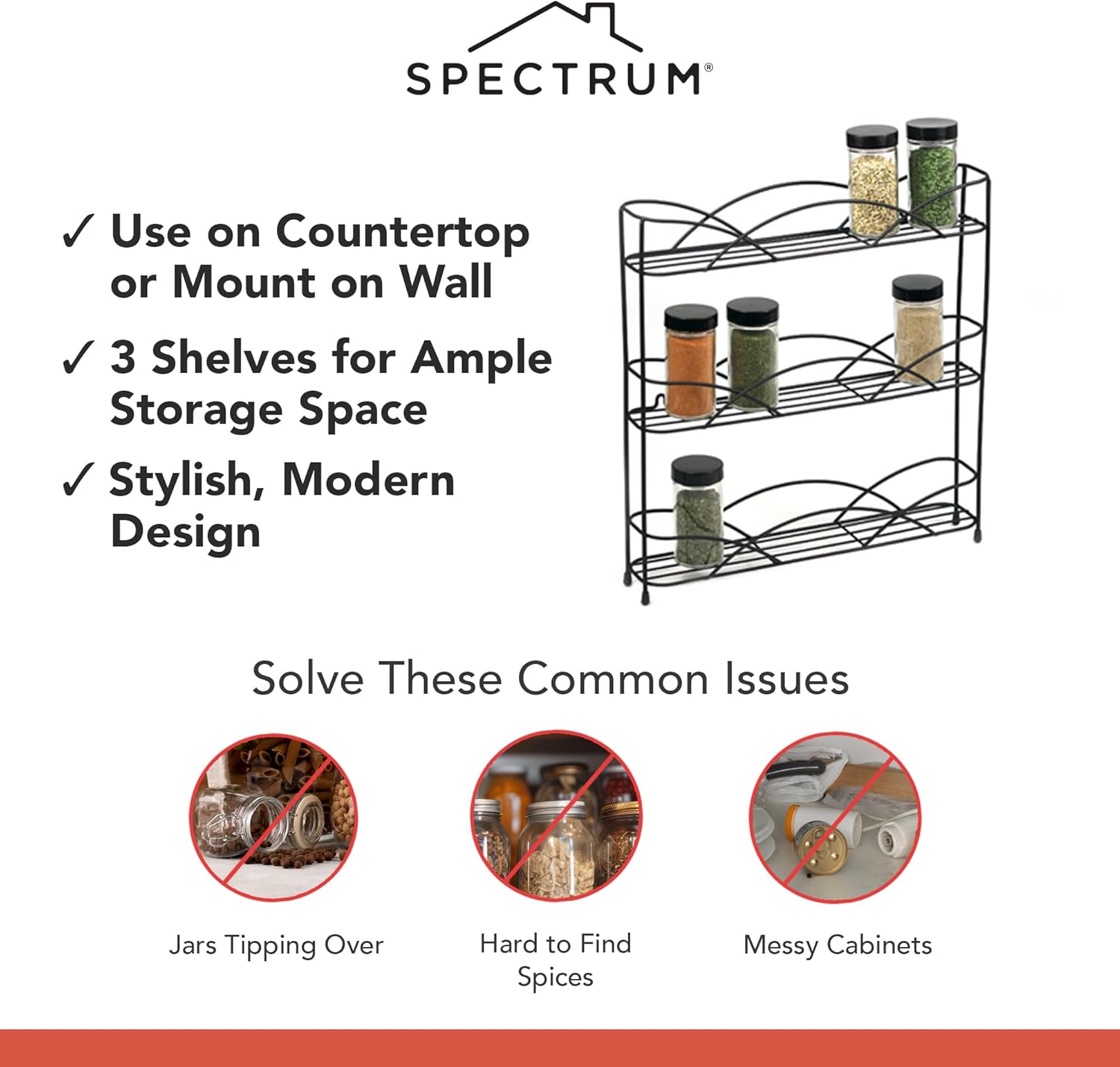 - Streamlined, Stylish Design: The simple, minimalist design of the Spectrum Countertop & Wall Mount Spice Rack is the perfect wire spice rack to organize your kitchen in style. 3-tier in black.