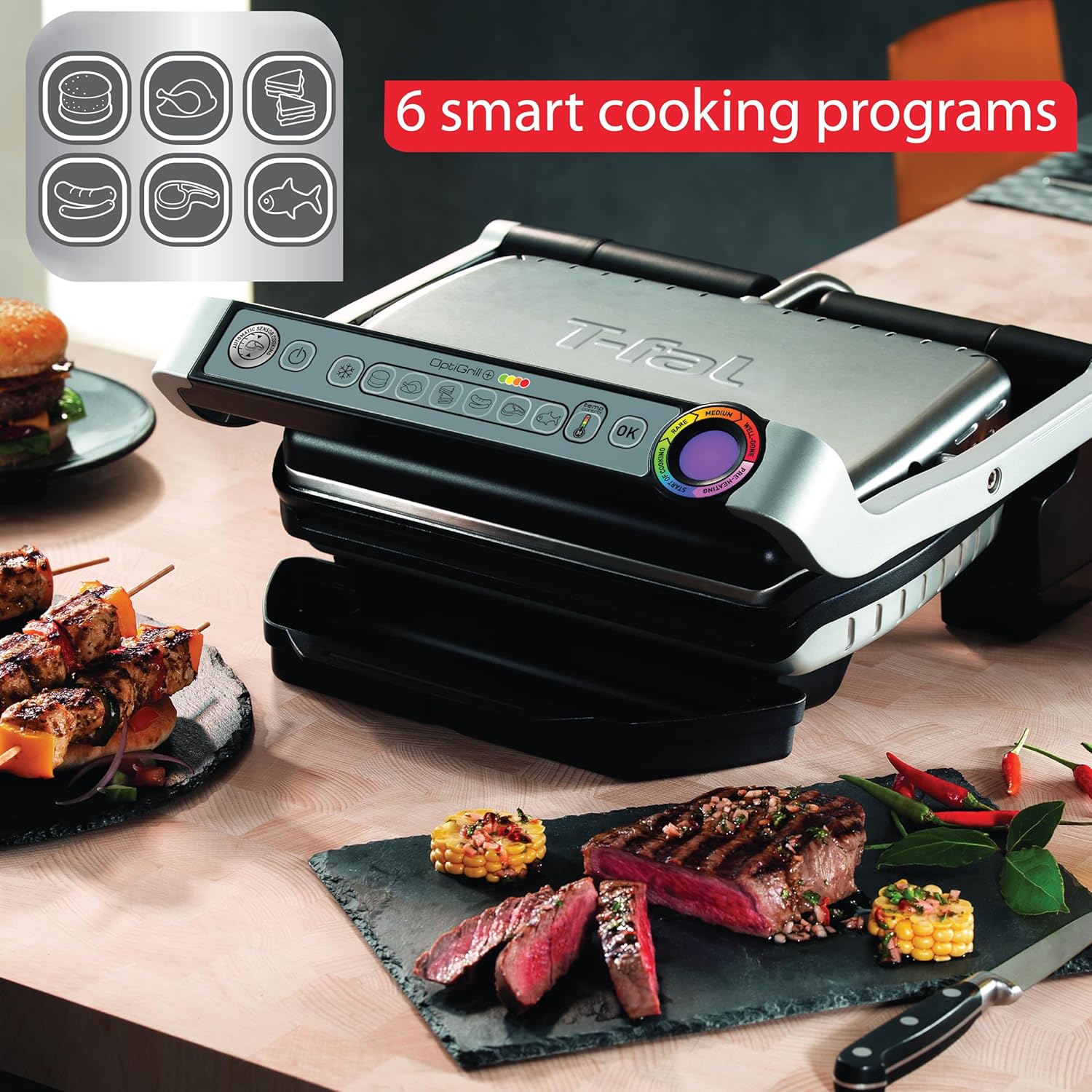 T-Fal OptiGrill Stainless Steel Electric Grill 4 Servings 6 Automatic Cooking Modes, Intelligent grilling rare to well-done 1800 Watts Nonstick Removable Plates, Dishwasher Safe, Indoor, Silver