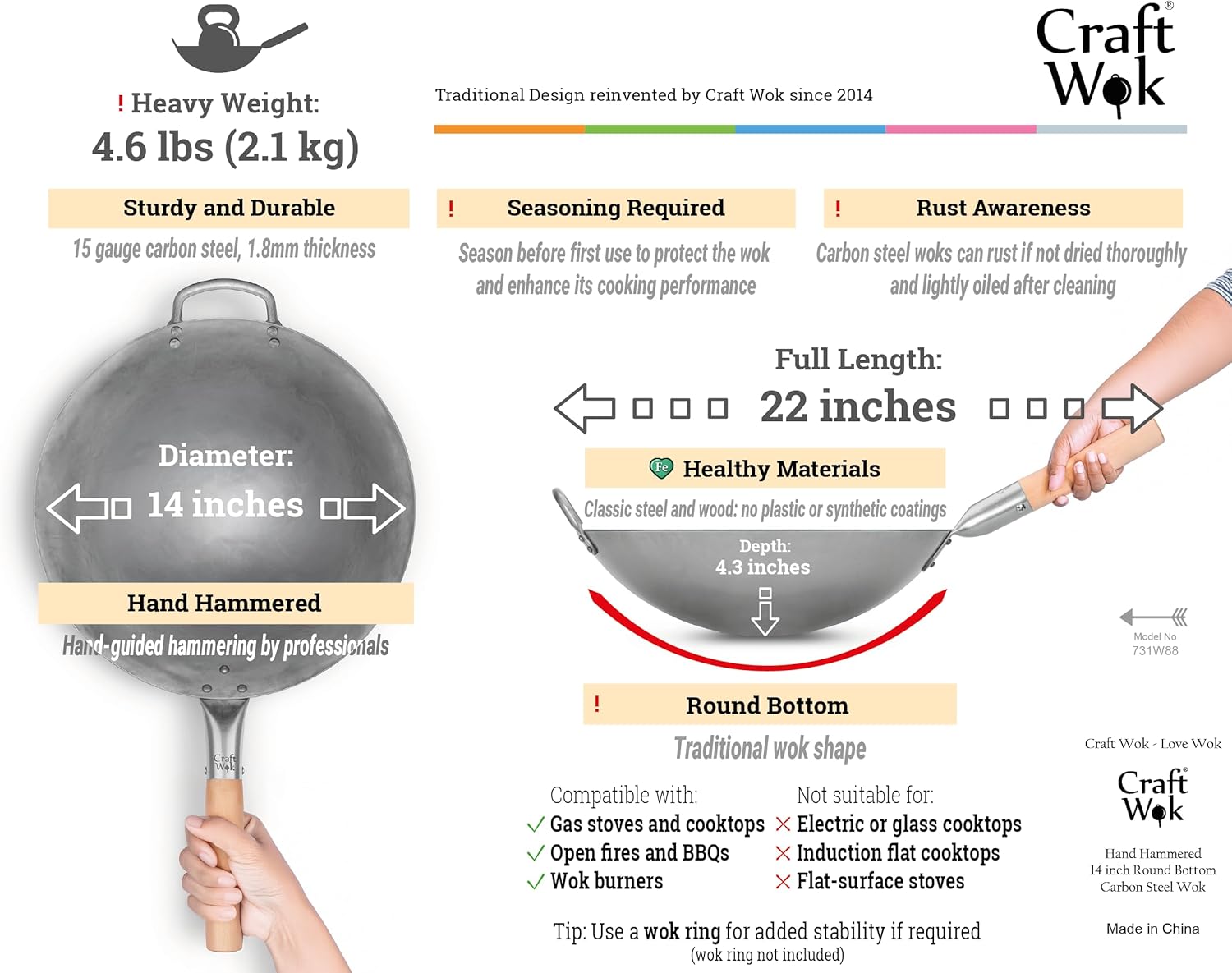 - PRODUCT BASICS: Round Bottom Heavy 14-Inch, 15-gauge (1.8mm) carbon steel wok, commercial grade. Original design by Craft Wok since 2014, with proven quality over the years. Chinese iron wok pan featuring a round bottom for home gas stovetops, professional wok jet turbo fast burners, open fire, BBQ, grills.