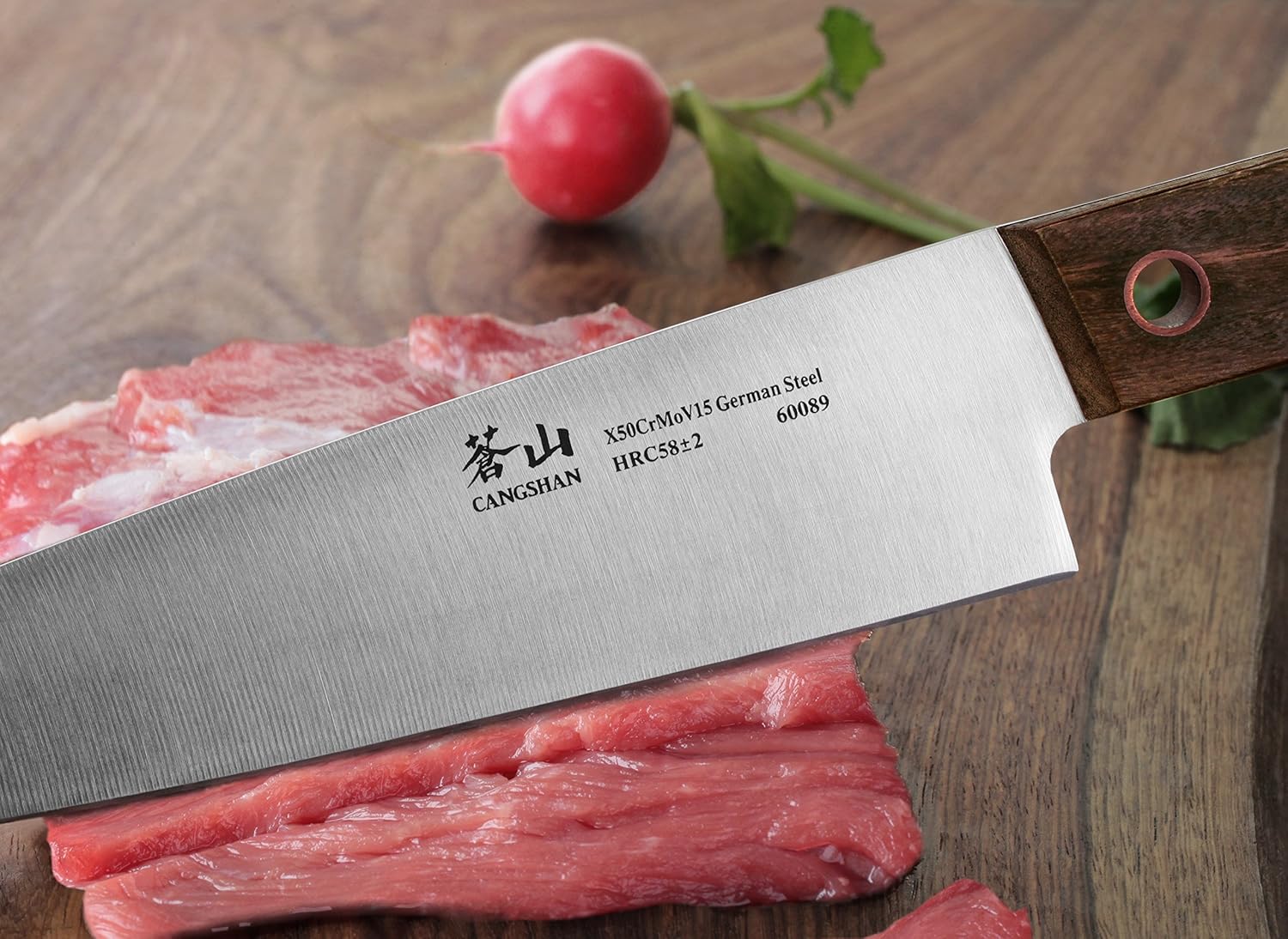- Hand crafted unique wood handle compliments the hollow copper rivets tastefully. These full tang knives are forged from fine grained, X50CrMoV15 German Steel for incredible durability, stain resistance and exceptional edge retention. 2016 Red Dot Award Winner. USPTO Patented Design.