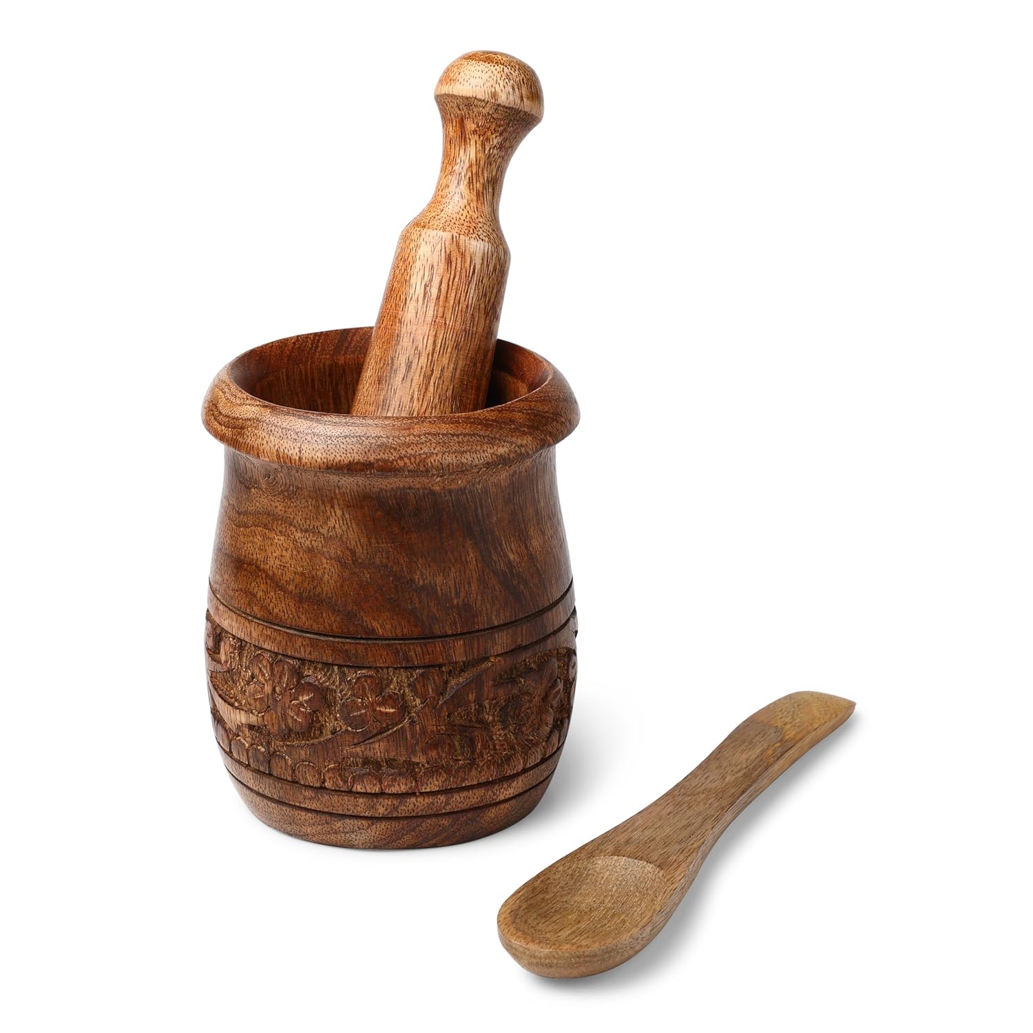 GoCraft Wooden Carved Mortar and Pestle | Grinder for Herbs, Spices and Kitchen Usage, Natural Mango Wood Engraved | Handmade Mortar and Pestle - 3.5 in