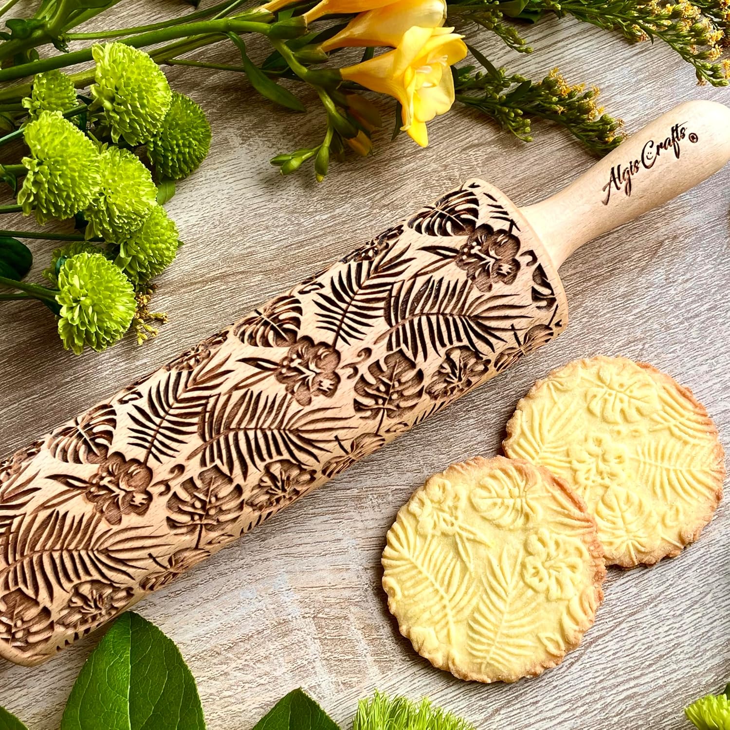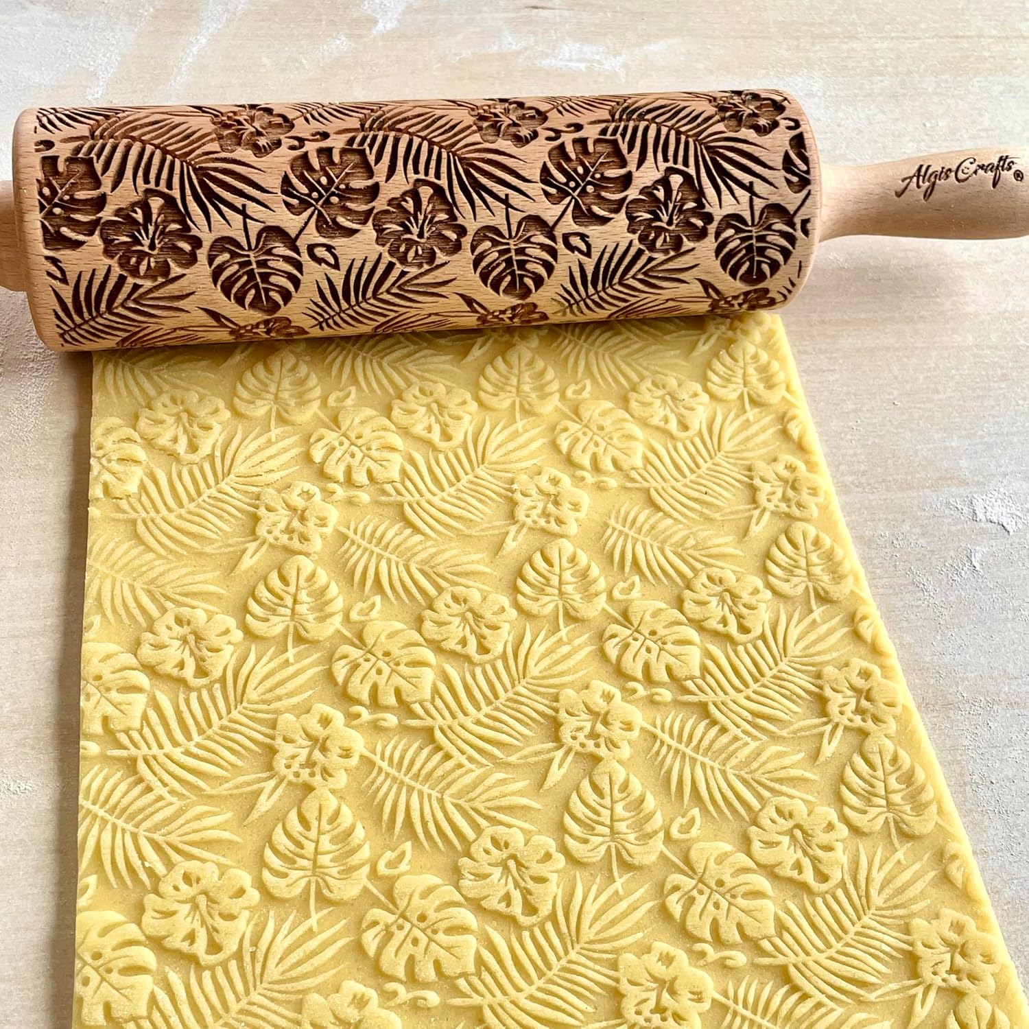 Embossing Rolling Pin RAINFOREST with Tropical Pattern. Dough roller for embossed cookies and Pottery by Algis Crafts
