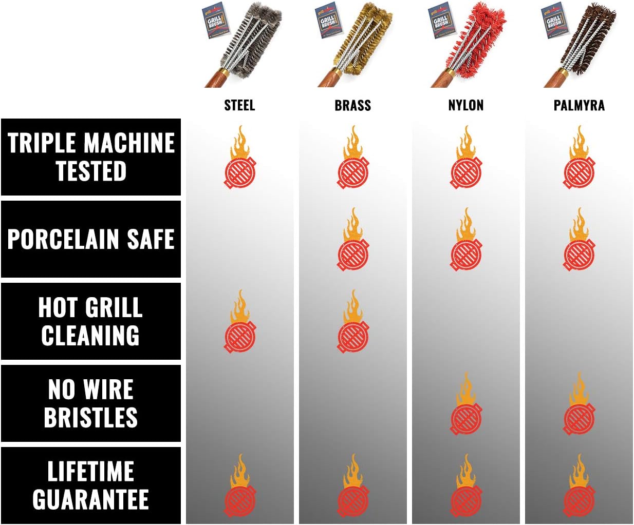 - Not All Grill Brushes Are Safe for All Grill Grates: Recommended for ALL grill types, palmyra bristles are not as sharp and won't scratch porcelain and ceramic grill grates. Own a Char-Broil, Weber, Big Green Egg, Blackstone, gas grills, charcoal, smokers, infrared?…Our premium grill cleaning brush doesn’t discriminate. It’ll scrape burnt-on food off any type or brand of grill with ease!