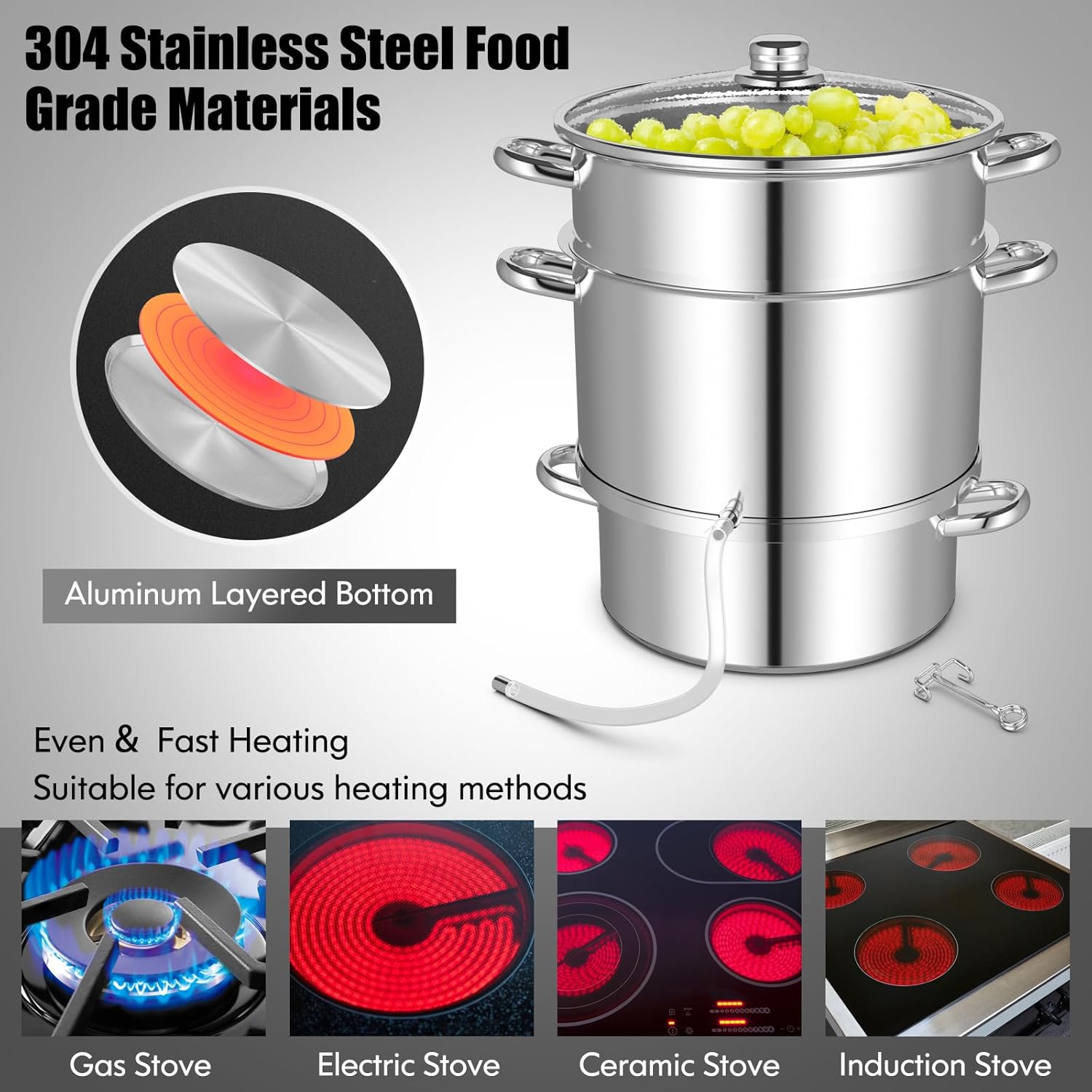 - ๐[Powerful Capacity]- This juicer steamer can be used on any range. The stock pot can hold up to 11 quarts fruits or vegetables. Its flat aluminum-clad bottom for even heating is suitable for any cooktop including induction cooker.