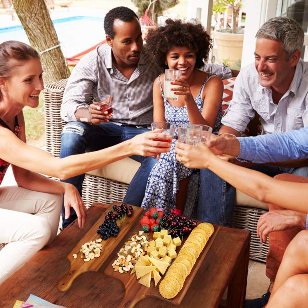 - Suitable Size: Acacia wood cutting board cheese board serving tray; measures 17 inches long with handle, 6 inches wide, 0.5 inches thick; ideal for serving bread, cheese, sandwiches, and party snacks at the table