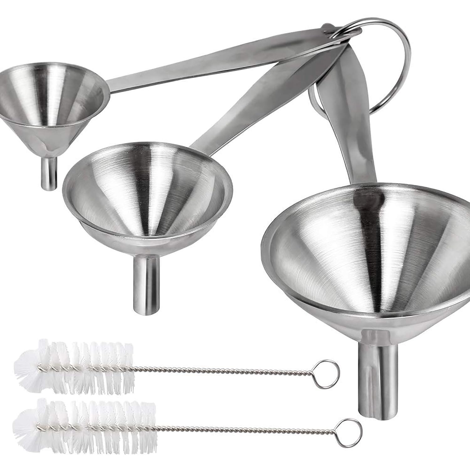 - Kitchen Funnel Set: Comes 3pcs small stainless steel funnels (large, medium, small) together with a ring, plus 2pcs funnel cleaning brushes, great funnels for filling bottles and various containers