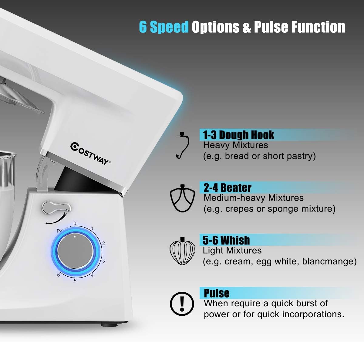 - TILT-HEAD & ANTI-SLIP DESIGN------The tilt-head design mixer allows access to install or uninstall bowl and its attachments easily by an easy-to-control knob, which also convenient for you to add ingredients for a recipe. Anti-slip suction cups are specially designed to keep mixer balanced and steady while working.