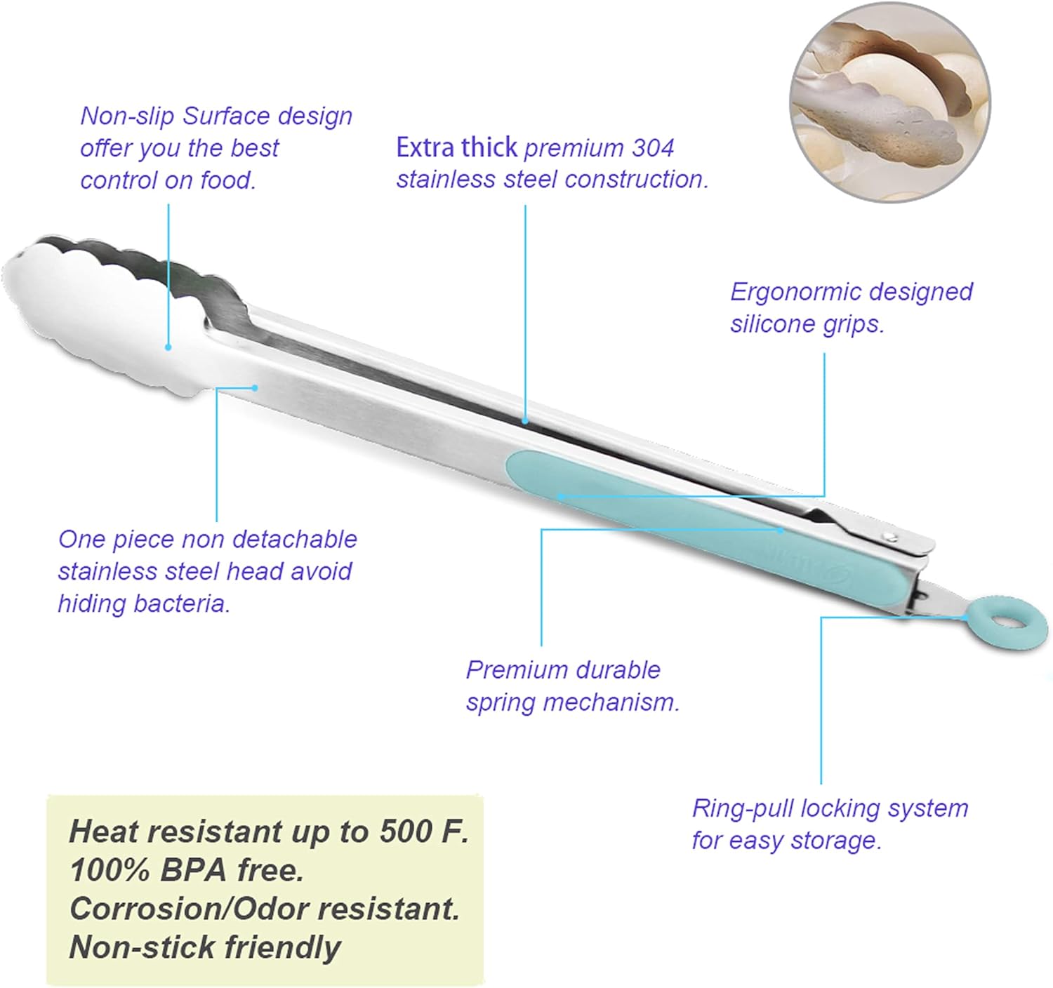 304 Stainless Steel Kitchen Cooking Tongs, 9" and 12" Set of 2 Sturdy Grilling Barbeque Brushed Locking Food Tongs with Ergonomic Grip, Aqua Sky