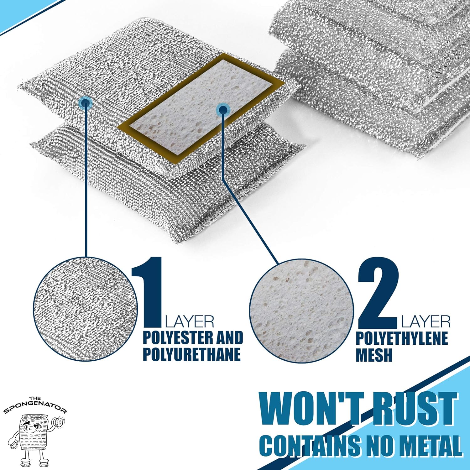 - DURABLE LONG LASTING MATERIALS: Unlike metal scrub sponges that rust easily, these polyester and polyurethane cleaner sponges will stain in excellent condition for up to 3 months (500 uses). Each set includes 6 scrubber pads in silver and gold, so you won’t have to buy a new pack anytime soon!