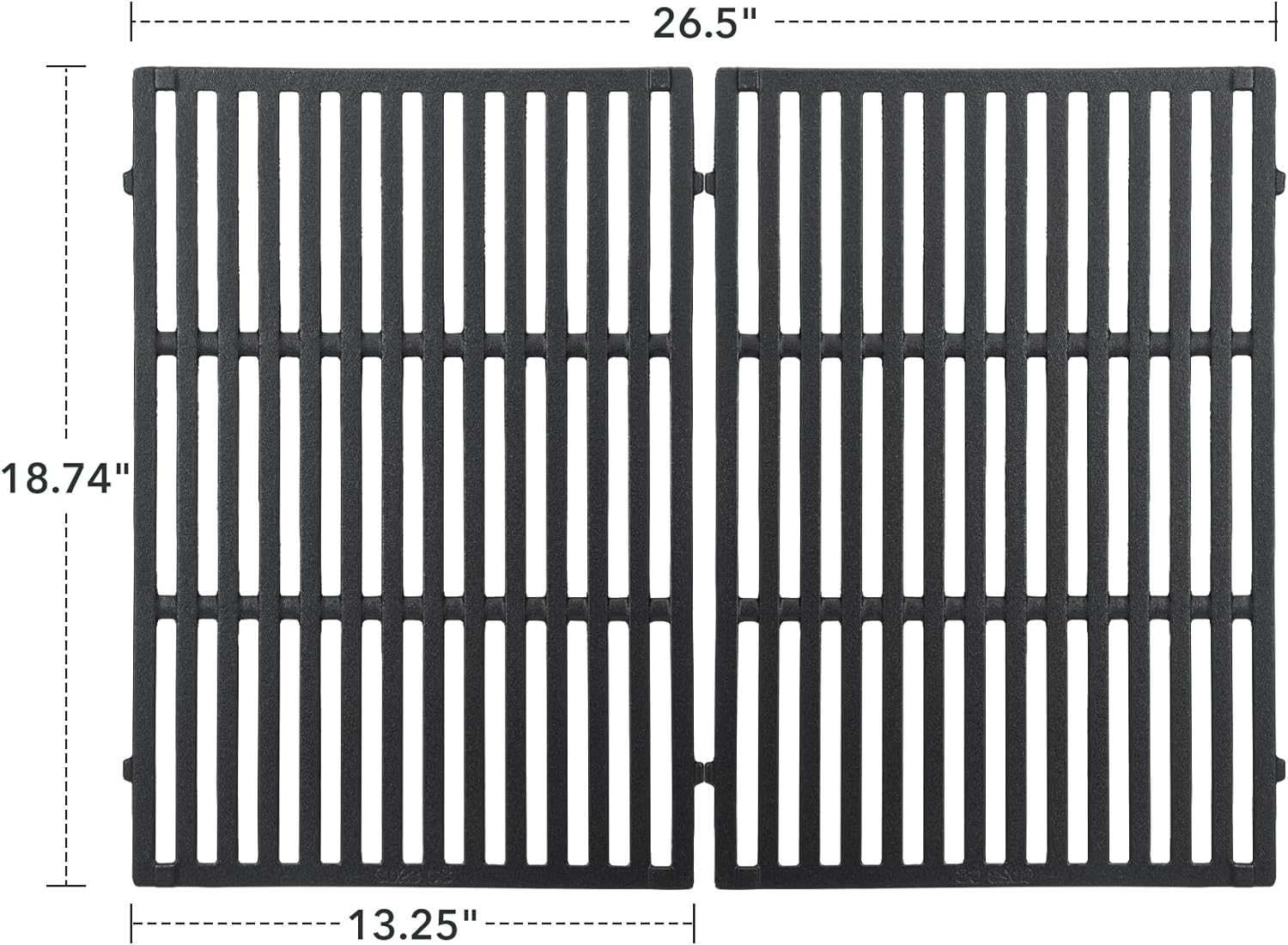 - 【DIMENSION & PACKAGE】18.75” x 13.25” for each grate, 18.75” x 26.5” for total. Comes with 2 cast iron cooking grates. Kindly compare with the SIZE and MODEL of your original parts before you order.