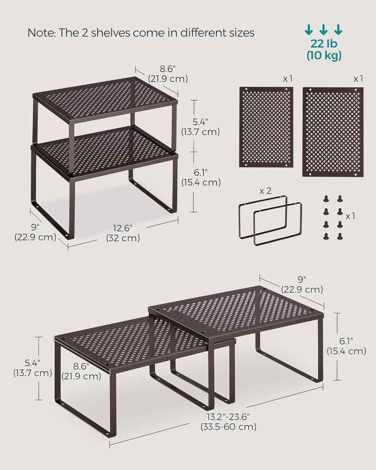 - [What You Get] 4 sturdy cabinet organizers (large shelf: 9"D x 12.6"W x 6.1"H; small shelf: 8.6"D x 12.6"W x 5.4"H) feature an easy-to-clean surface and strength to support heavy loads, maximizing the use of vertical space in your counter or cabinet