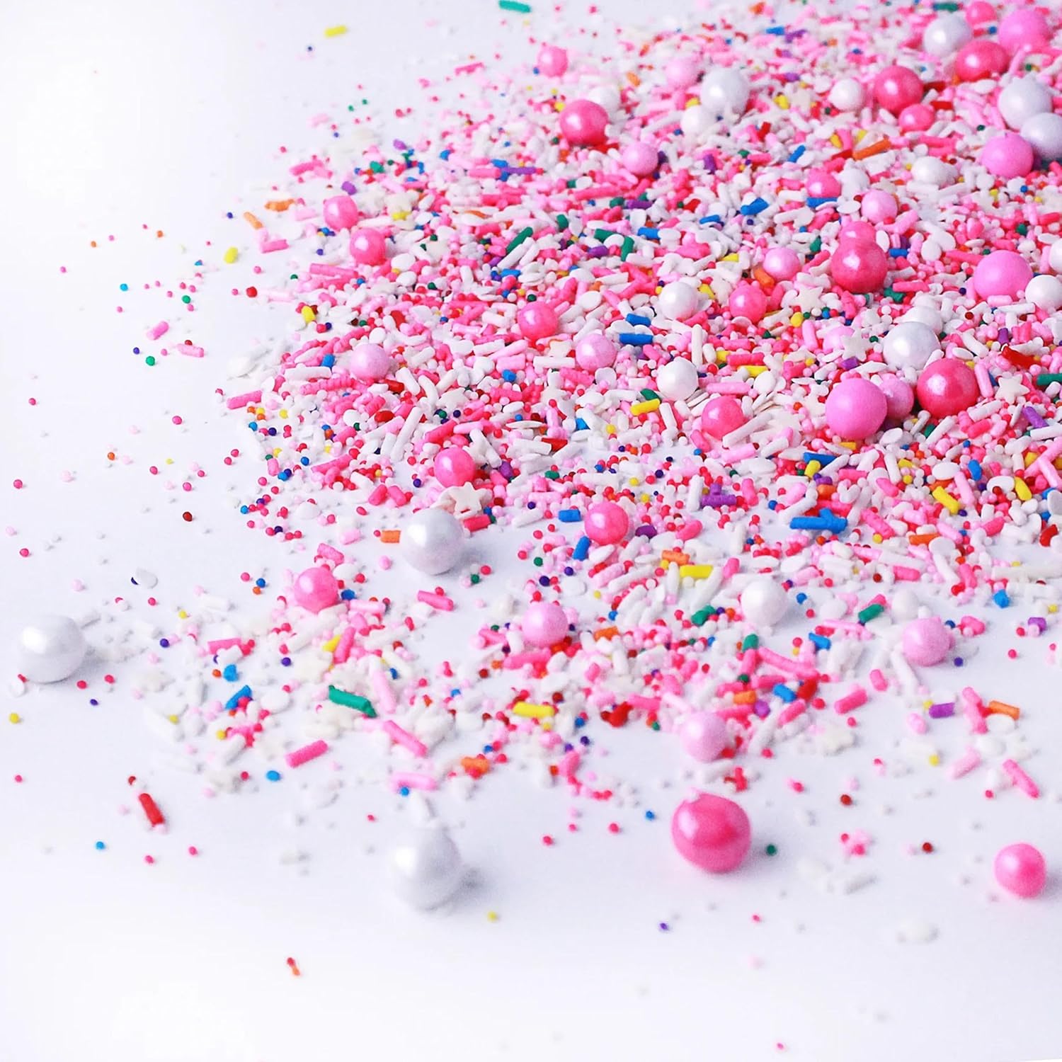 - Transport yourself back to childhood with our frosted affair sprinkles mix, featuring pink and white sprinkles with rainbow pops, perfect for decorating girl baby shower, gender reveal, and birthday cakes, cupcakes, donuts, cookies and more