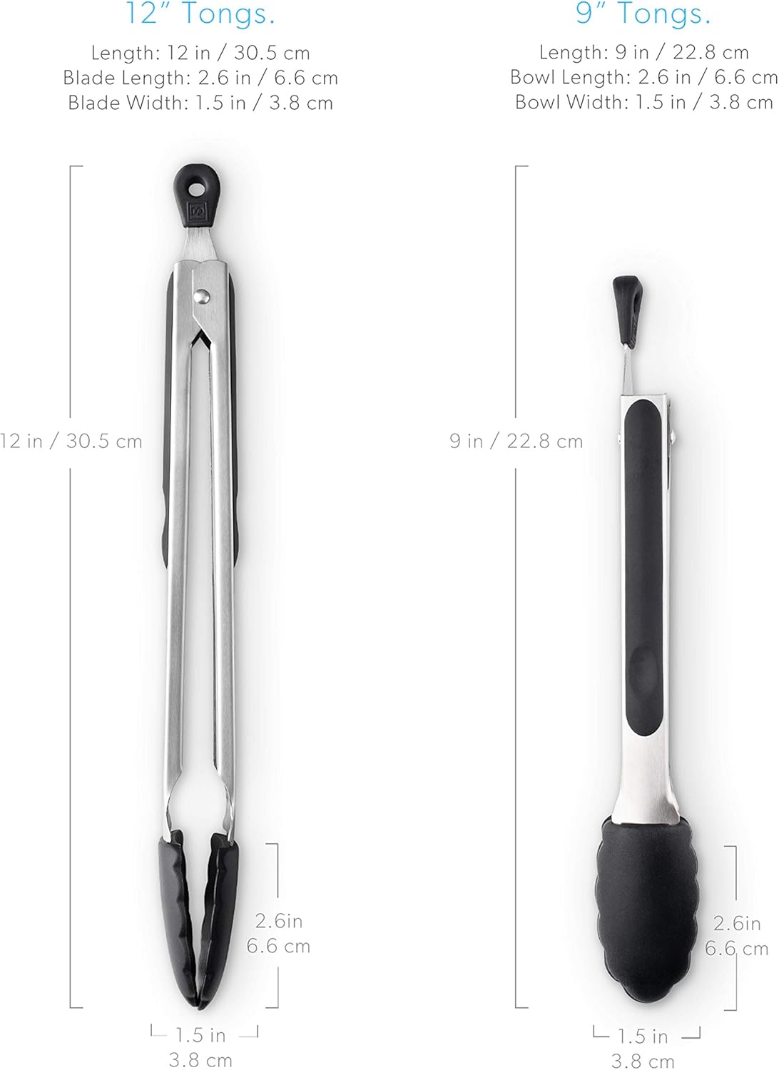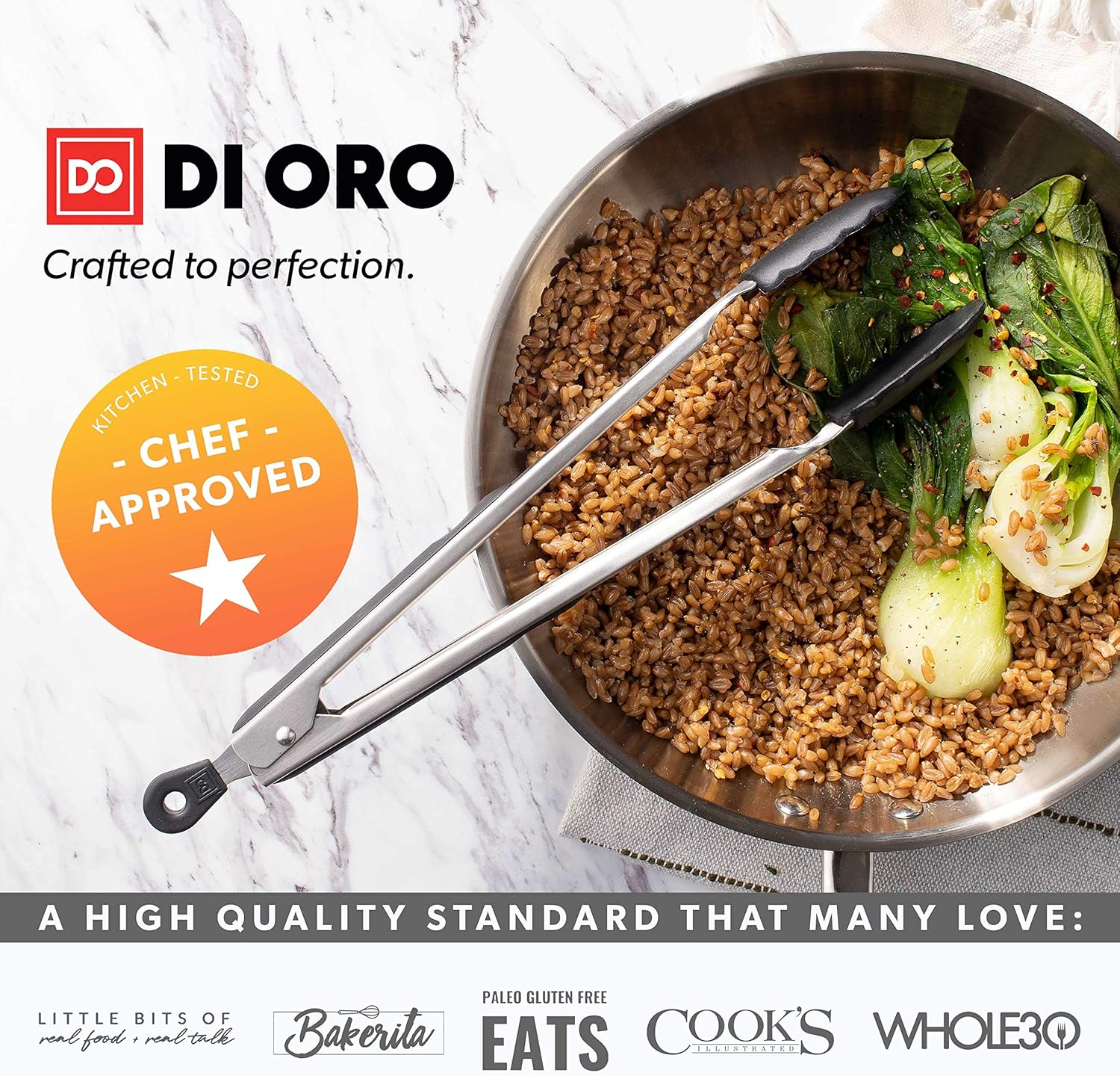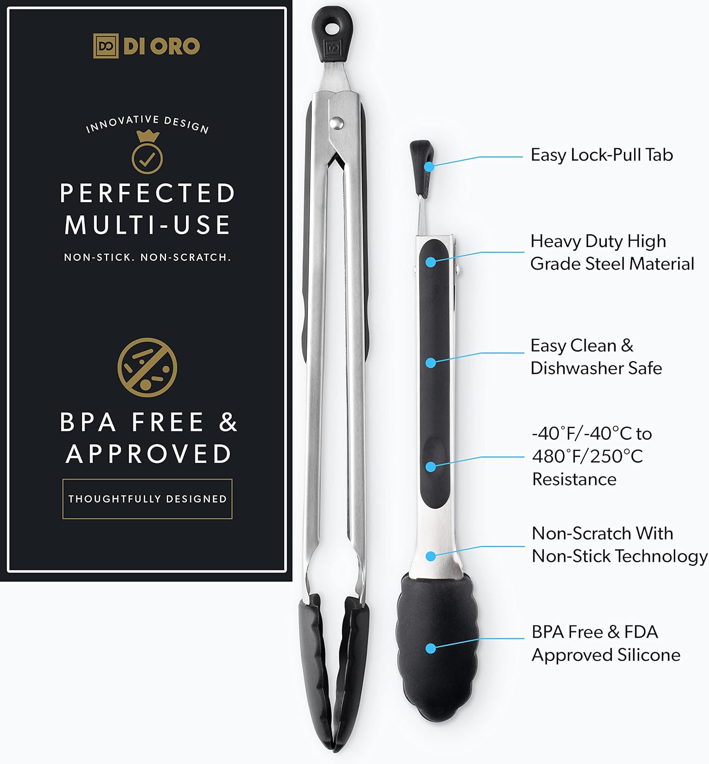 - HEAVY-DUTY STAINLESS-STEEL KITCHEN TONGS - While cheap and inferior tongs consistently fail, the DI ORO 2-Piece Silicone Kitchen Tong Set is engineered with heavy-duty stainless steel and silicone tips to prevent scratches and damage to your cookware. Each set will stand the test of time as they have been rigorously kitchen tested and expertly sized (9” and 12”) to ensure a multitude of applications can be used on a daily basis in home and commercial kitchens.