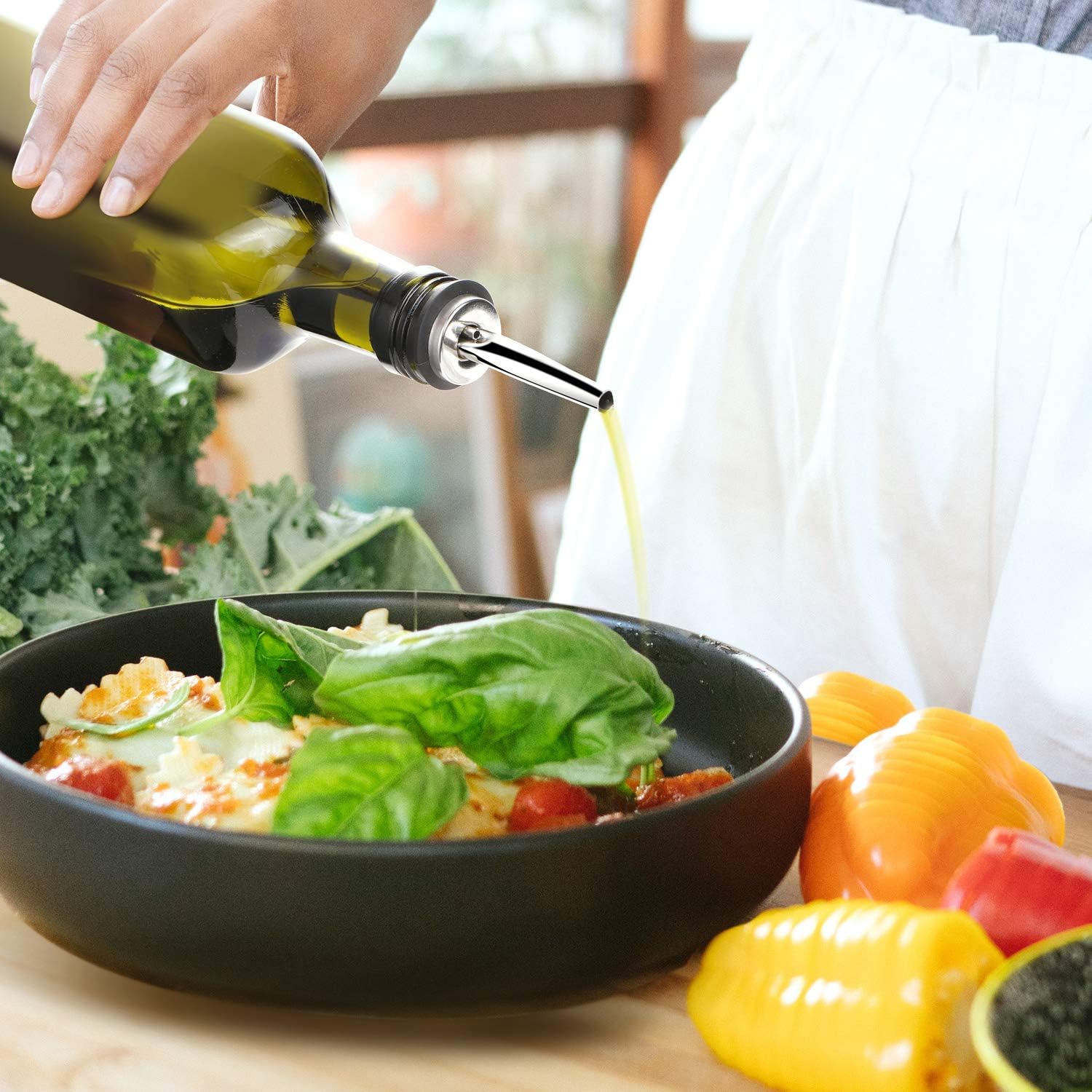 - NON-DRIP DESIGN - 18/8 Stainless steel pour spouts with sealed cap and flap cap fit the bottle well and perfectly keep dust out. Everyone can pour and dispense oil with a nice stream without leakage. Ideal for dispensing cooking oils, dressings and vinegars.