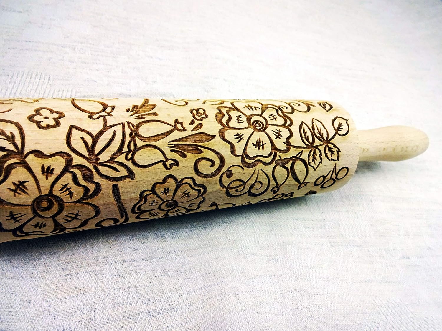 - Constructed out of highly durable Beech wood, this laser-etched rolling pin is optimally sized to roll out dough, with a large 7.9" embossing surface, 2.4" diameter, and 15.8" overall length (with handles).