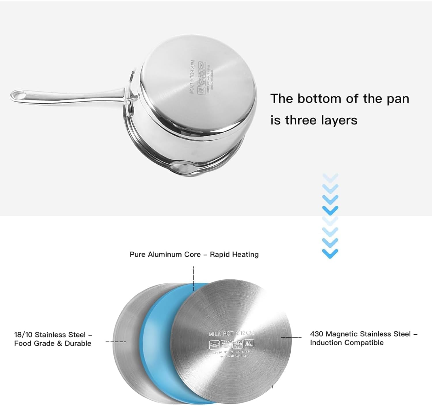 - Tri-Ply Construction: Our small sauce pan features a tri-ply structure at the bottom—18/10 stainless steel interior, aluminum core, and magnetic stainless steel base—for even heat distribution. Compatible with induction, gas, and electric cooktops.