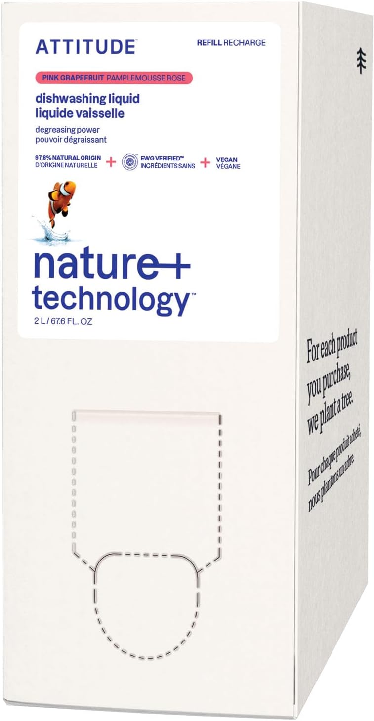 ATTITUDE Dish Soap Refill, EWG Verified, Plant-Based & Vegan Dishwashing Liquid, Naturally Derived, Pink Grapefruit, 67.6 Fl Oz