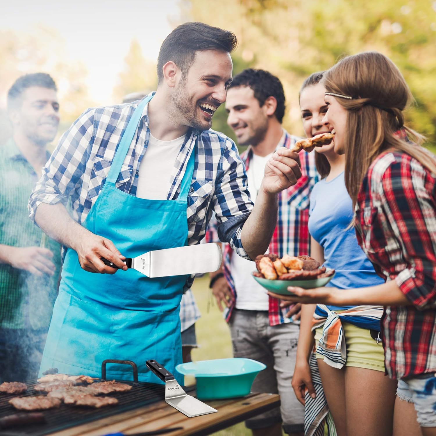 - Heavy duty & sturdy - griddle spatula set is tough. The comfortable ABS plastic handle securely attached to metal spatula with triple rivets. These griddle grill accessories are designed to last a lifetime. Stainless steel griddle spatula metal thickness is 1/25 inch