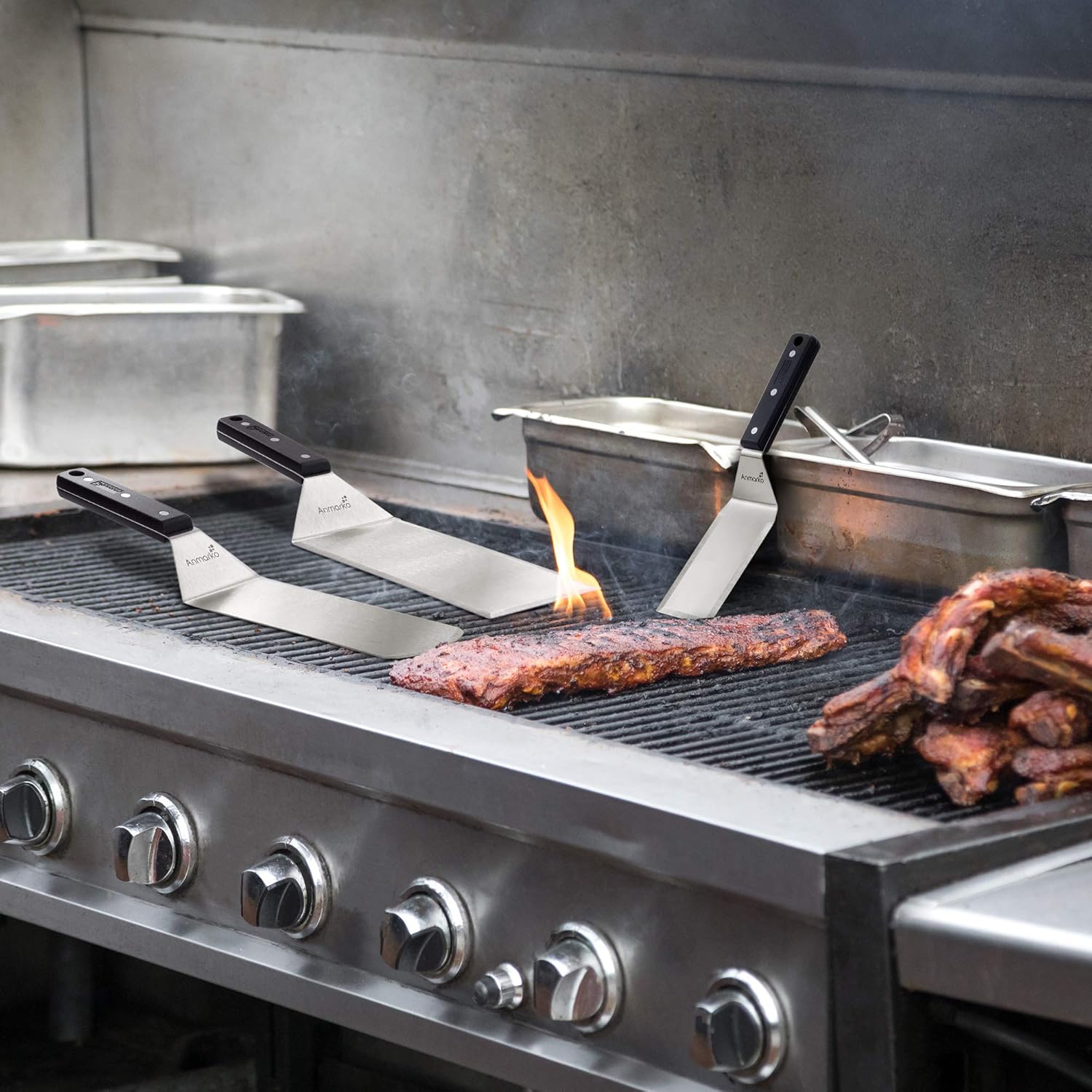 - Food safe stainless steel - griddle utensil set is made of durable non-reactive stainless steel featuring 1 long metal spatula, 1 grill flat top spatula and 1 griddle scraper commercial