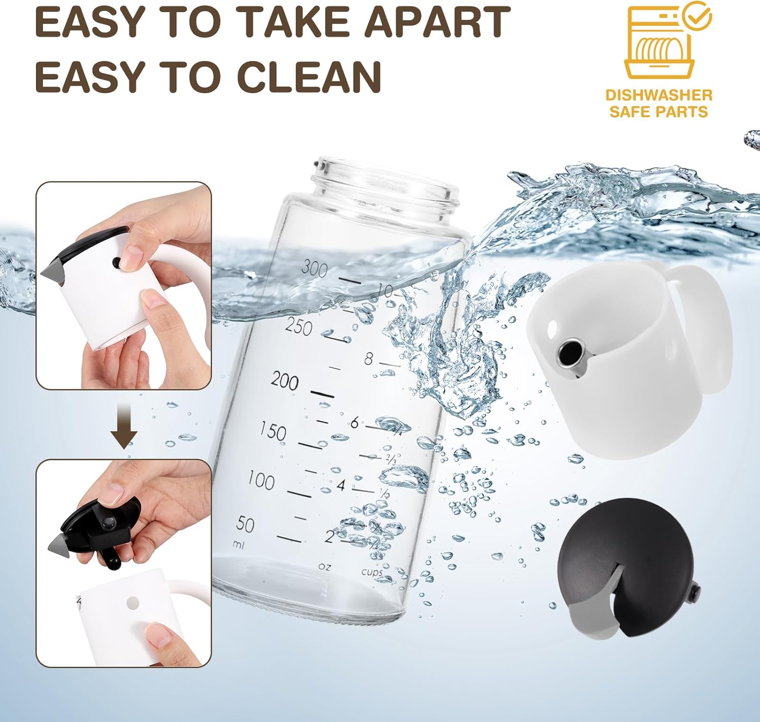 - No-Drip Spout & Leakproof Bottle - Unique spout with clear measurements labeled on the glass oil bottle to greatly avoid dripping and you can better control the amount of oil and no worry about over dressing. Non-Drip Spout, keep your hands and the oil kitchen dispenser clean.