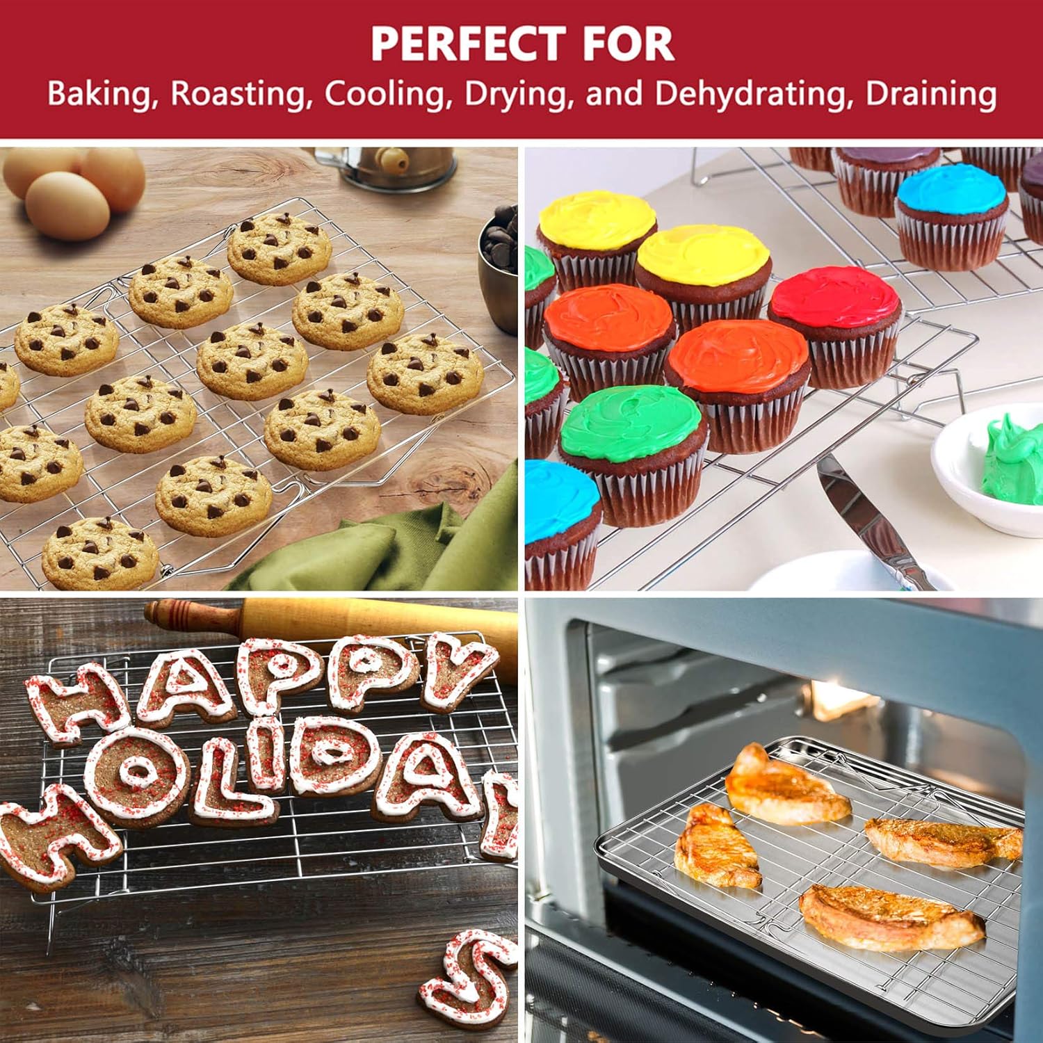 - 【MULTI FUNCTION】All pieces 15’’L x 10.2’’W, Fit in 16’’ x 11’’ or larger sheet pans, 3Pcs a set, More economical than buying them separately, Easily combined into multi-layer rack for daily use, Greatly applicable to Cooling Pastries, Baking Meat and Poultry, Dehydrating Pork /Beef Jerky, Draining Grease and Water,etc.