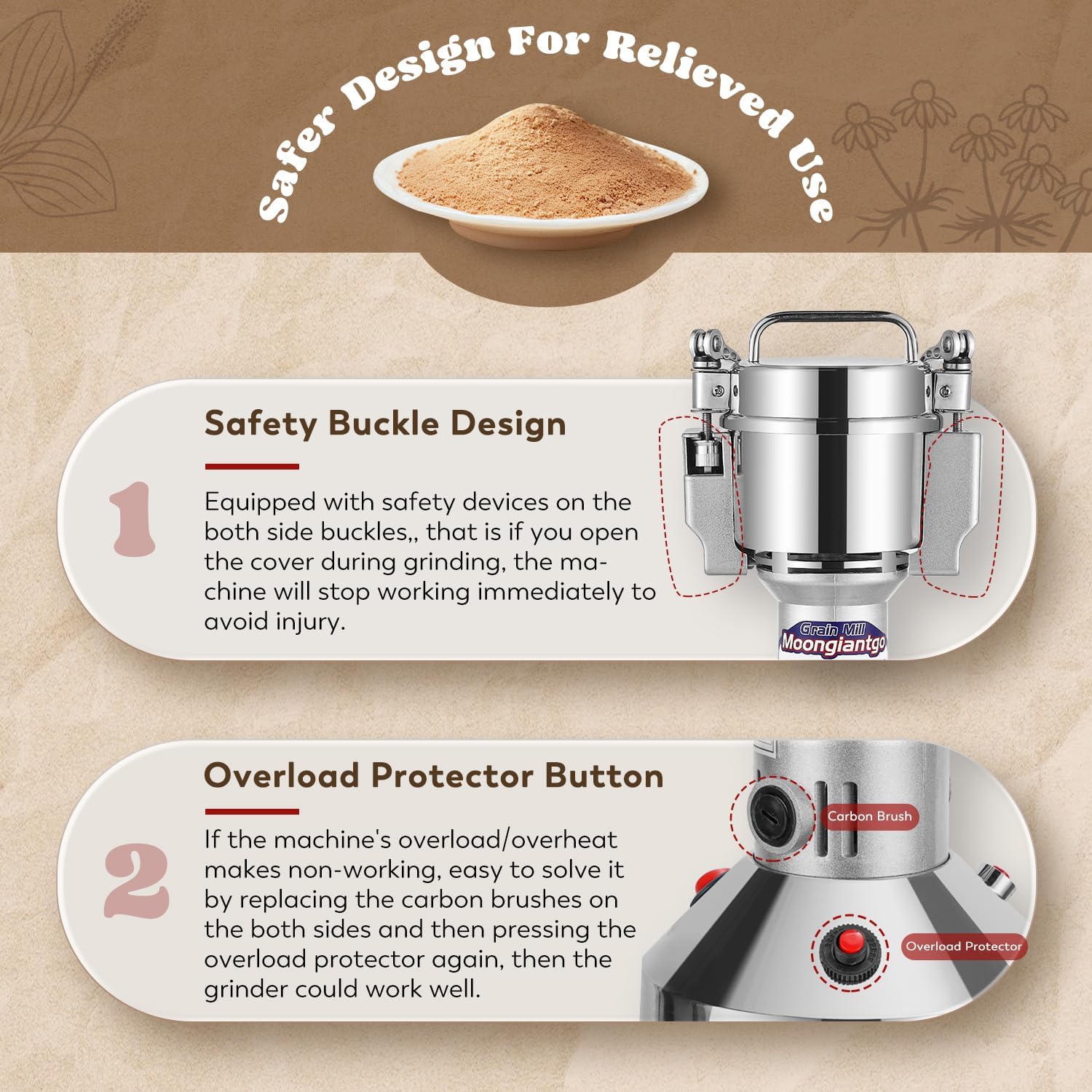 - Safer Design For Relieved Use - Our electric grain grinder is equipped with safety buckles on the both sides, which will immediately stop the machine from working if you open it during grinding to prevent injury. And with upgraded overload protector, the grinder will stop working to prevent the motor burnout in cases of overload or overheating.