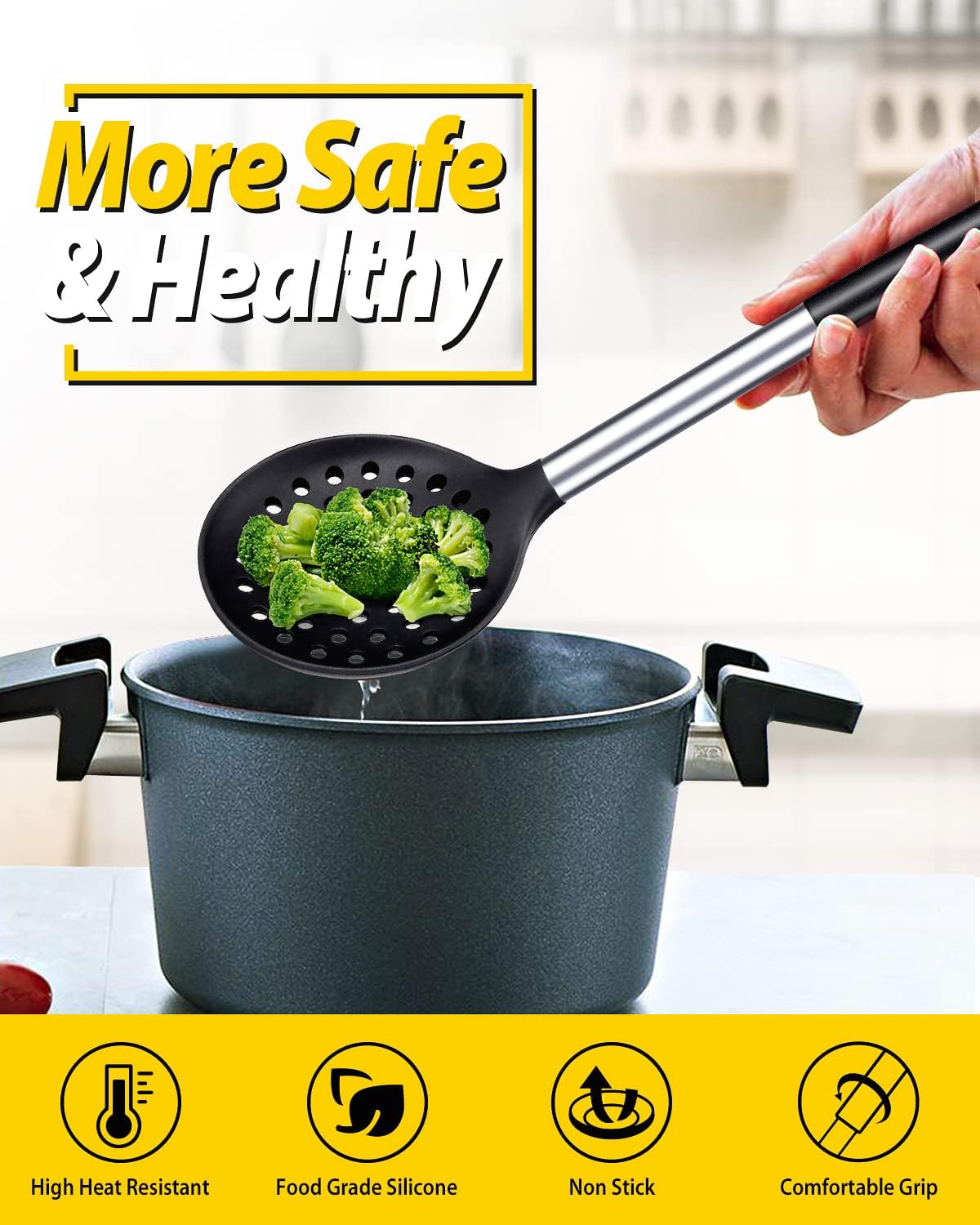 - Thoughtful Design : The good-quality 18/8 stainless steel keeps you away from the trouble of kitchen utensils rusting or breaking; This anti-scald silicone handle is not easy to conduct heat and is more comfortable to hold than traditional utensils