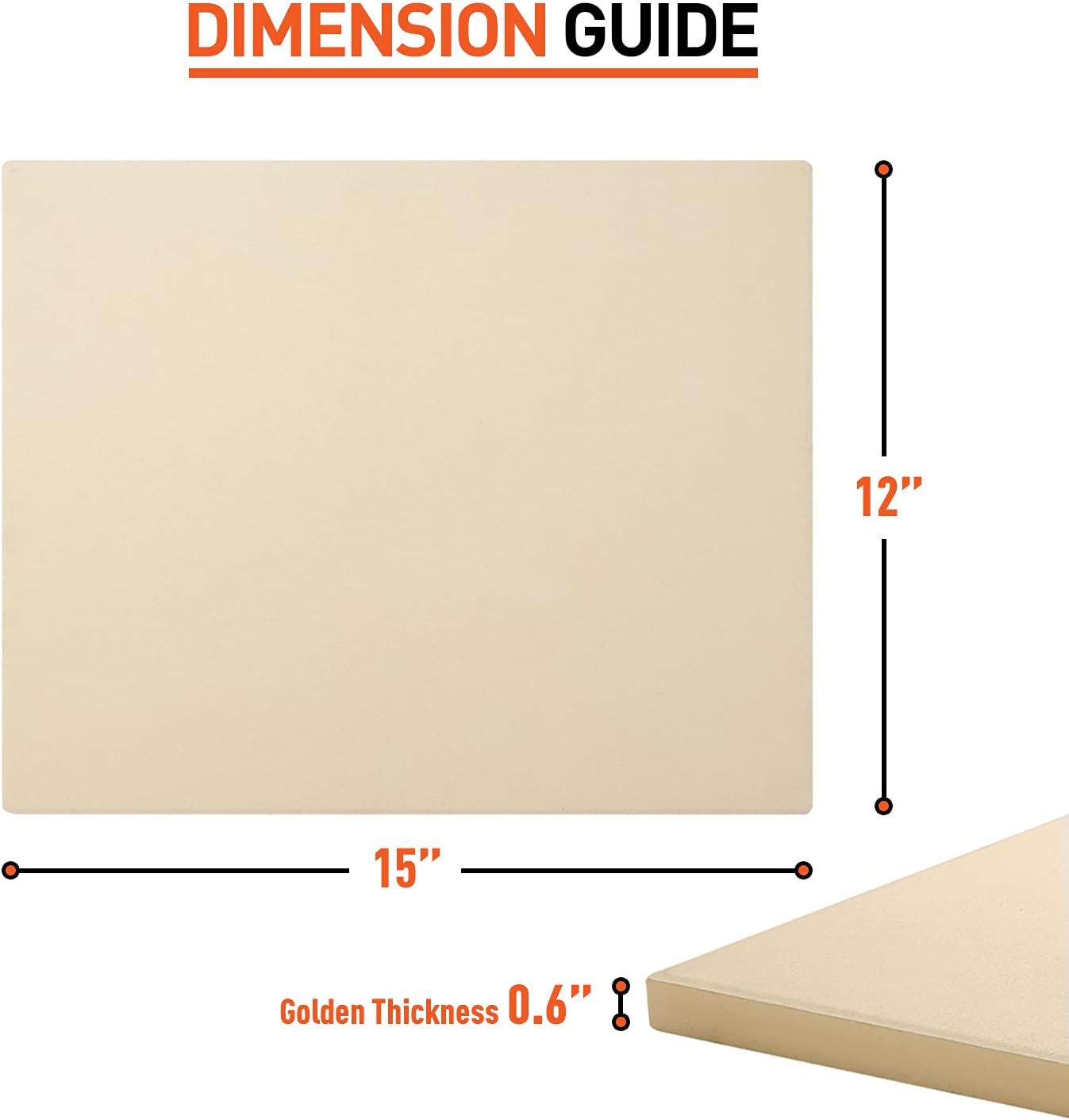 - PERFECT SIZE FOR MAKING PIZZA - Measures 15" x 12", golden thickness 15mm, weights up to 6.6 LBS. The multipurpose pizza stone for grill can be used more than just for pizza, it’s also great for making cookies, pastry bread, biscuits, calzone etc.