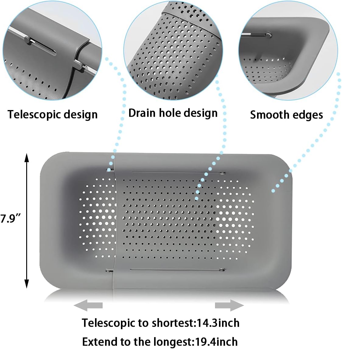 Collapsible Sink Colanders and Strainers Basket Over the Sink Colander Collapsible Colander Extendable Plastic Fruit Vegetable Strainer Drainer Basket for Kitchen (Length 14.3 inch-19.4 inch) (Gray)