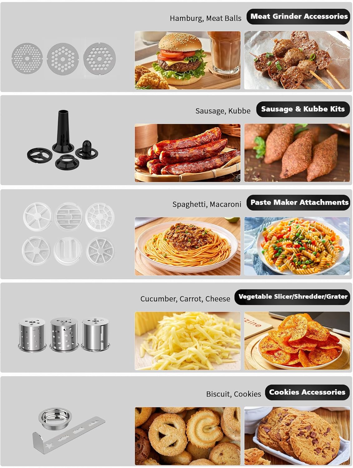 - 9-in-1 KITCHEN MACHINE - Vospeed kitchen stand mixer is a multi-functional food processor. It is equipped with a dough hook, whisk, beater, juice blender, meat grinder! It’s a perfect kitchen helper for making cakes, bread, cookies, smoothies, juicer,salad, sausage, meat sauce etc. The splash guard helps to add ingredients without making a mess