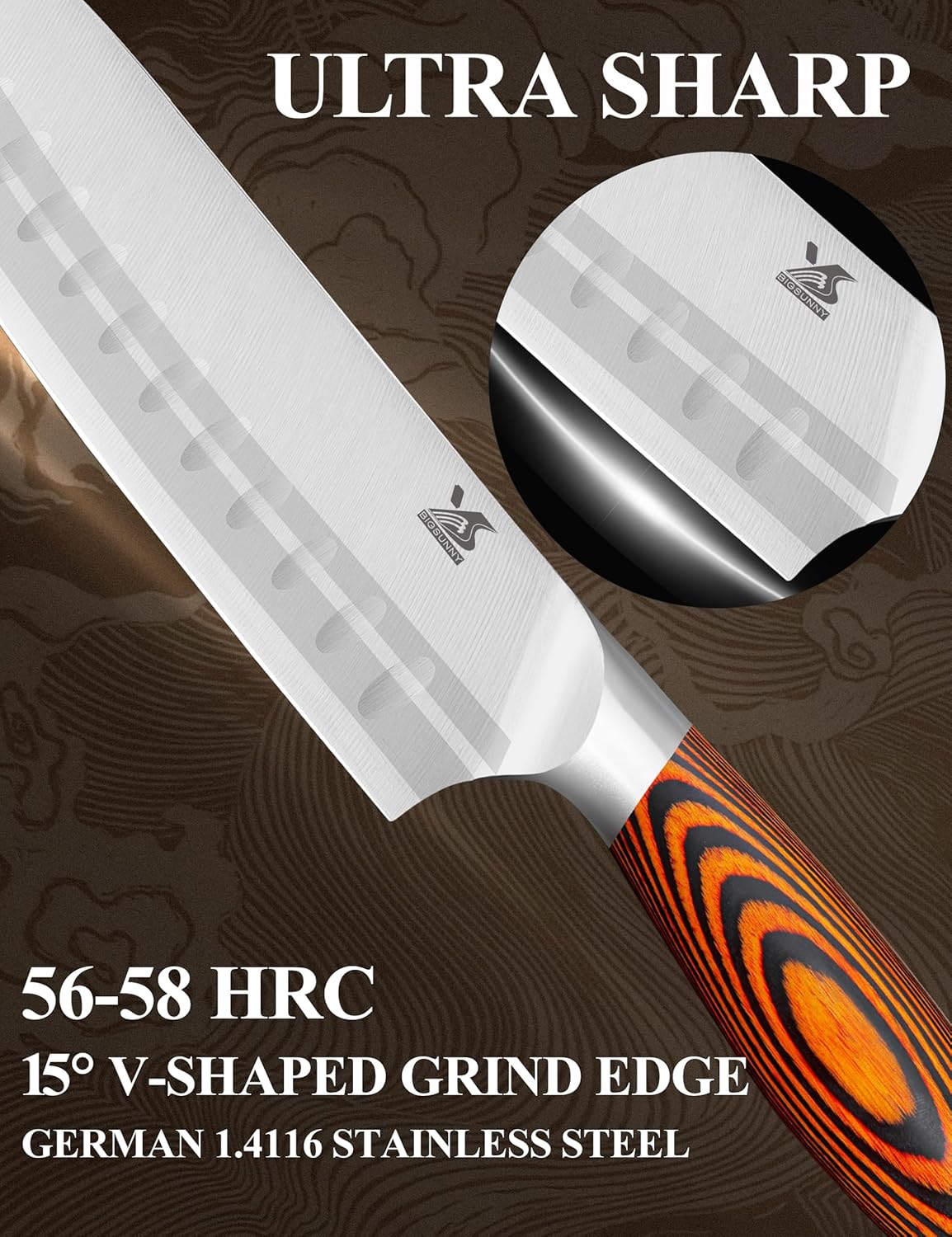- 【Ergonomic Design】Pakkawood handle for a durability yet balanced and comfortable grip. Every curve and angle of the handle is ergonomically designed for a comfortable and ambidextrous hold. The shape of the blade also brings you a minimal slicing resistance. Most importantly, excitement back to cooking.