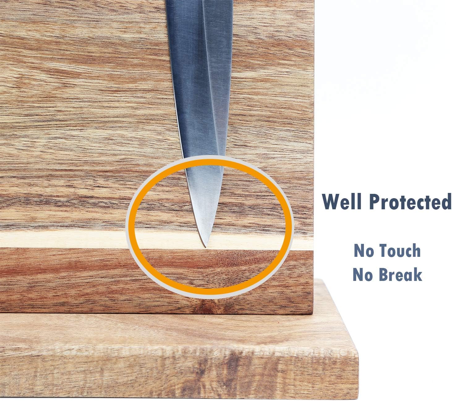- Anti- Slip Feet & Wood Grain: Non Slip Base Knife Dock-Finished with slip-proof anti-skid felt pads on the bottom, our wood knife block is safer to use on slippery counter tops than ordinary blocks. No more skidding, slipping, sliding or wobbling around!Your Magnetic Knife Holder is made of NATURAL acacia wood. The natural wood can be different in wood grain. This imperfection is the mark of an natural product.