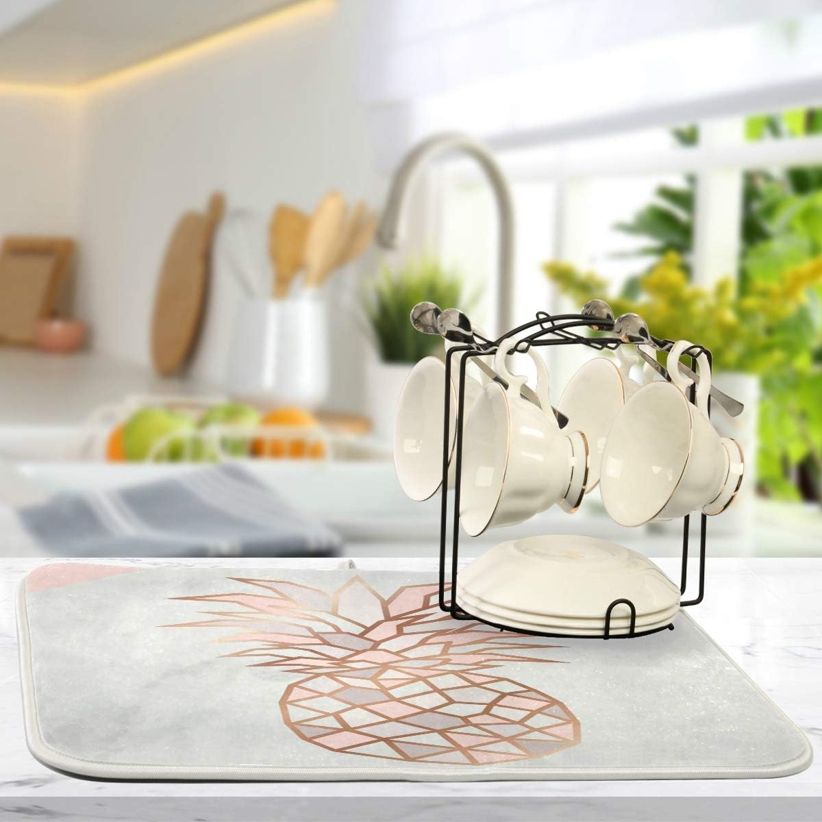 Super Absorbent Dish Drying Mat, Microfiber Fast-Drying Dish Mat, 24" x 18", Kitchen Dish Drying Pad, Rose Gold Pineapple On Pink And White Marble