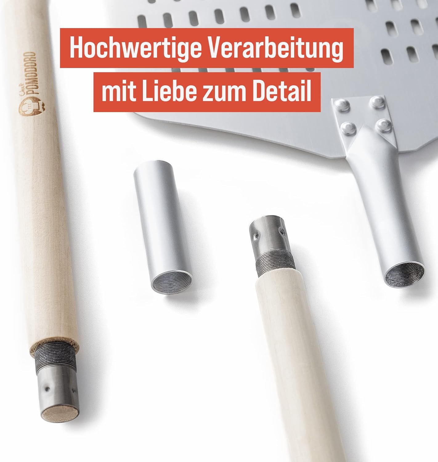 Chef Pomodoro Perforated Pizza Peel Aluminum, 12 x 14-Inch, with Detachable Wood 49-Inch Long Extendable Handle for Easy Storage, Gourmet Luxury Pizza Paddle for Baking Homemade Pizza Bread