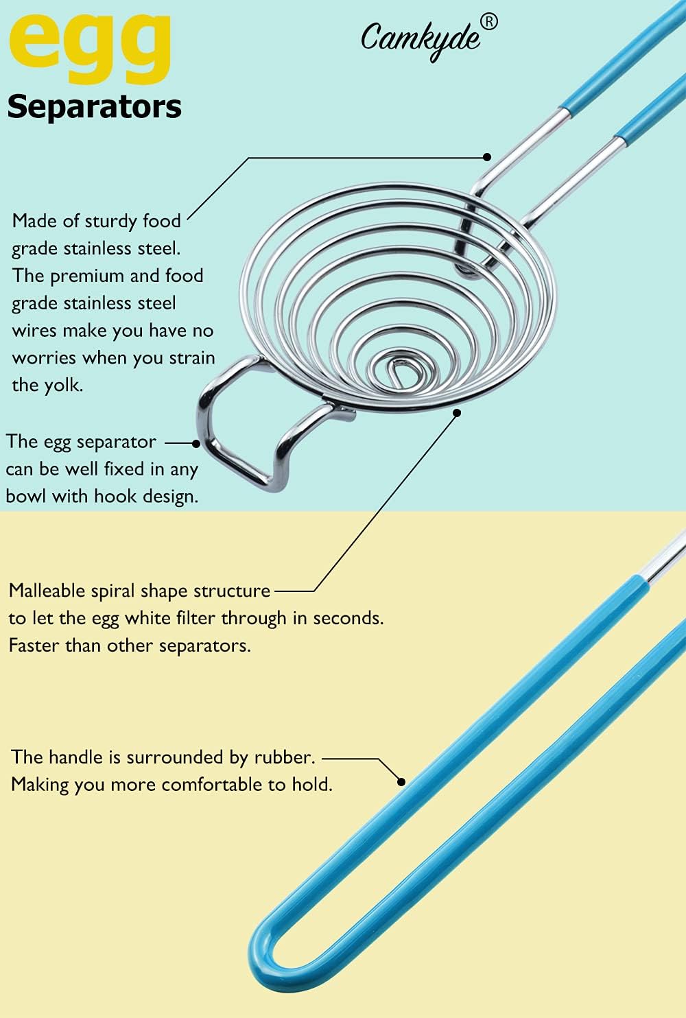 - INSTANTLY FILTER EGG YOLKS. The spiral structure of the egg divider allows the egg white to be filtered instantly. The spring coil with just the right spacing will keep you from losing any egg yolk. The egg sieve with hook fits any size bowl, no more worry about getting your hands messy and no eggshell pieces went into the bowl.