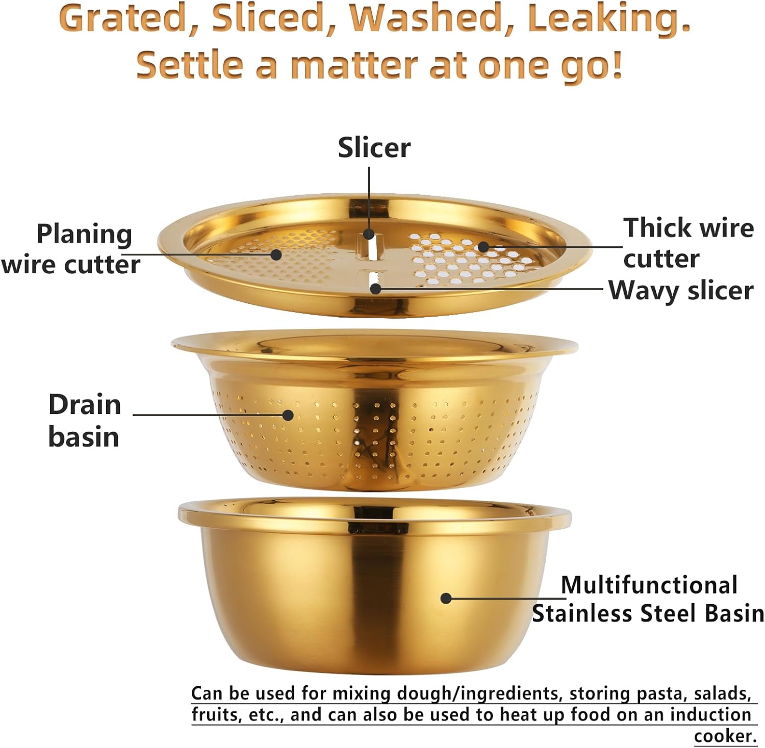 Meisha Colander, 3Pcs Stainless Steel Kitchen Tool 3 in 1 Drain Basket Fruit and Vegetable Cutter Strainer Bowl Set Drain Pot Basket Grater for Fruits Vegetables Rice Washing Mixing - Gold
