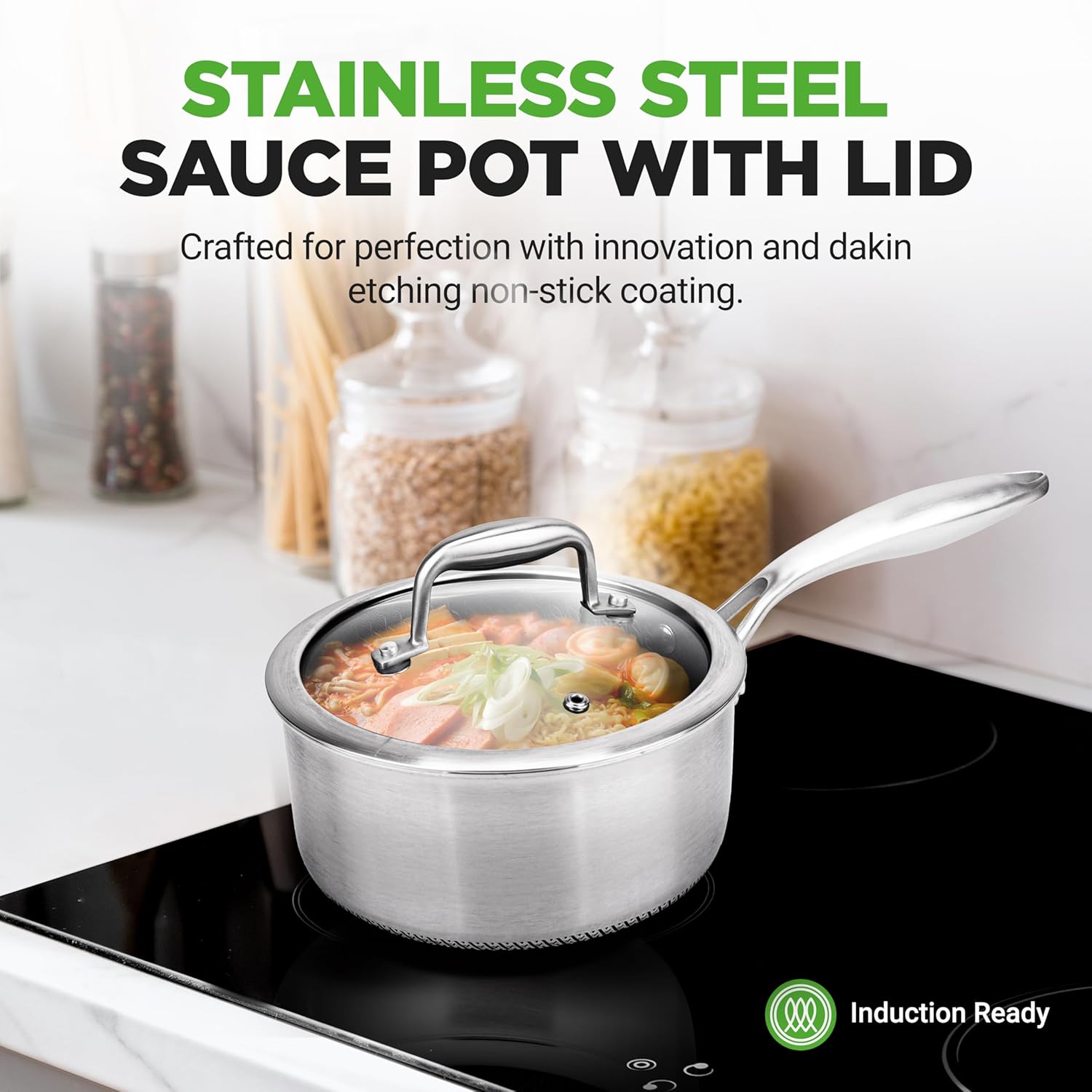 NutriChef 2 QT Stainless Steel Sauce Pot - Triply Kitchenware Sauce Pot with Glass Lid - DAKIN Etching Non-Stick Coating, Scratch-resistant Raised-up Honeycomb Fire Textured Pattern - NutriChef NC3PSP
