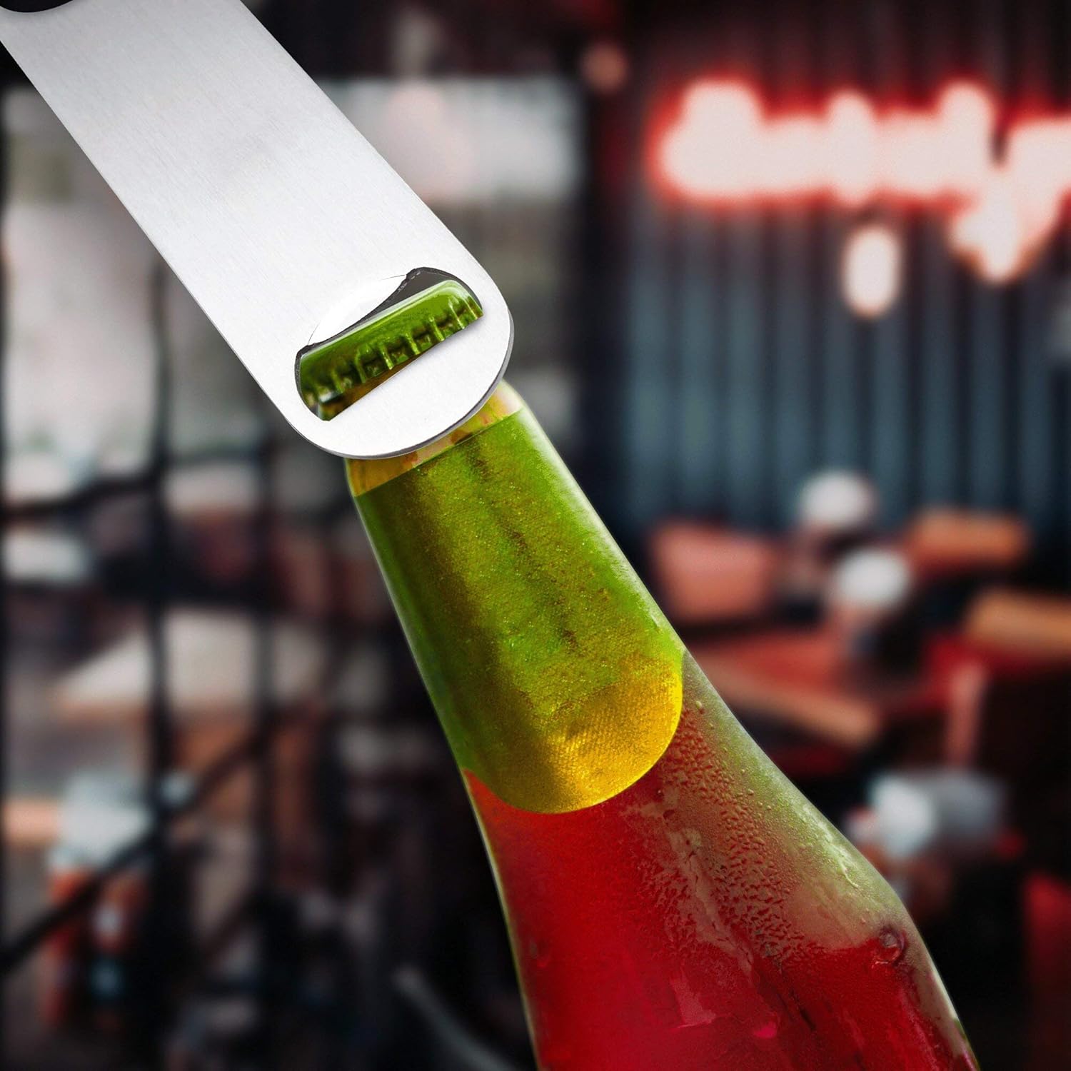 - STAINLESS STEEL - this extra strong stainless steel beer bottle opener is designed to quickly remove the caps off your favorite brews, beers, or bottled sodas.