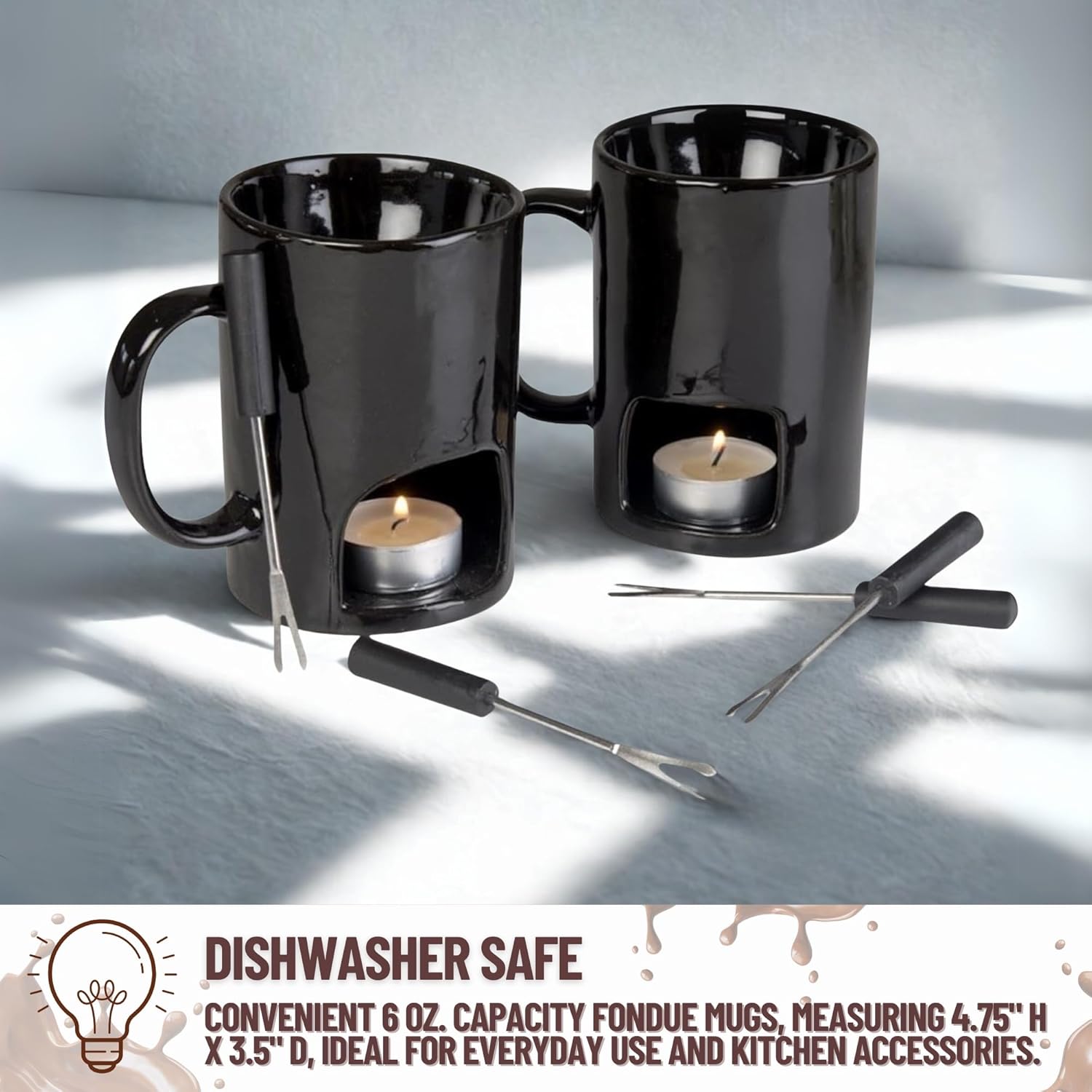 - All Occasions : Evelots set of 2 personal fondue mugs with 4 forks and 8 tealight candles. Each mug features a special compartment to hold a fondue tealight to keep your fondue at the right temperature. Whether you choose cheese or chocolate, our fondue mug set for 2 is sure to melt your heart and that of your sweetheart! Ideal for romantic meals, Valentine's Day, anniversaries or birthdays. Makes a perfect gift. Sold on Amazon for over 6 years