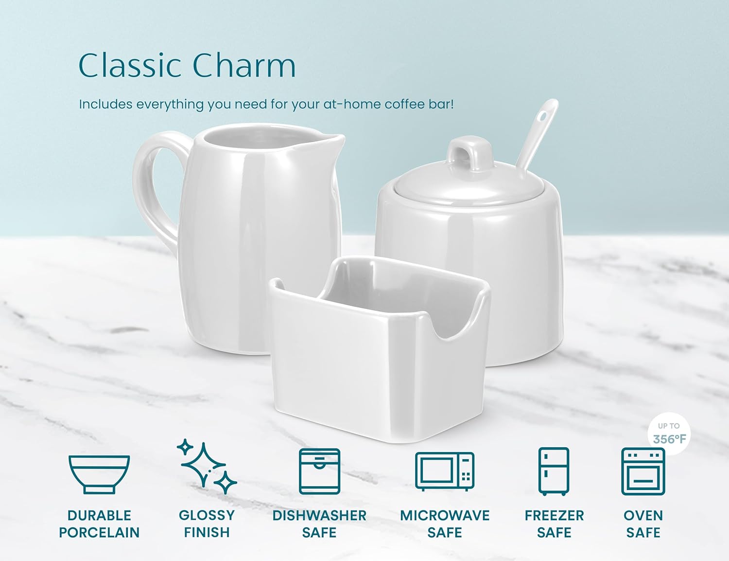 - Classic Charm: Includes everything you need to set up your own home coffee bar! Includes a milk and creamer dispenser, a sugar container with a lid and tiny spoon, and a sweetener packet holder