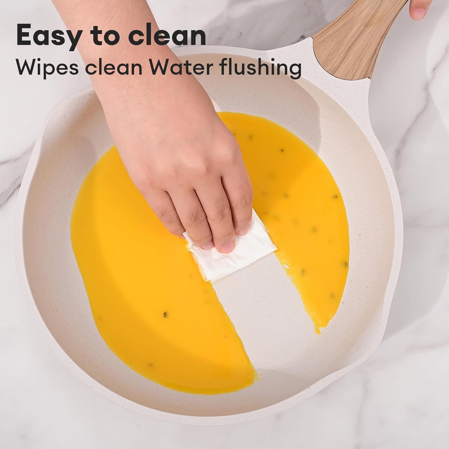 - 【Super Easy To Clean】Our non-stick frying pan cleans up in seconds, the eco-friendly coating makes cleaning a breeze, wipe it with a paper towel or rinse it with a little water. Hand washing is recommended to maintain coating longevity