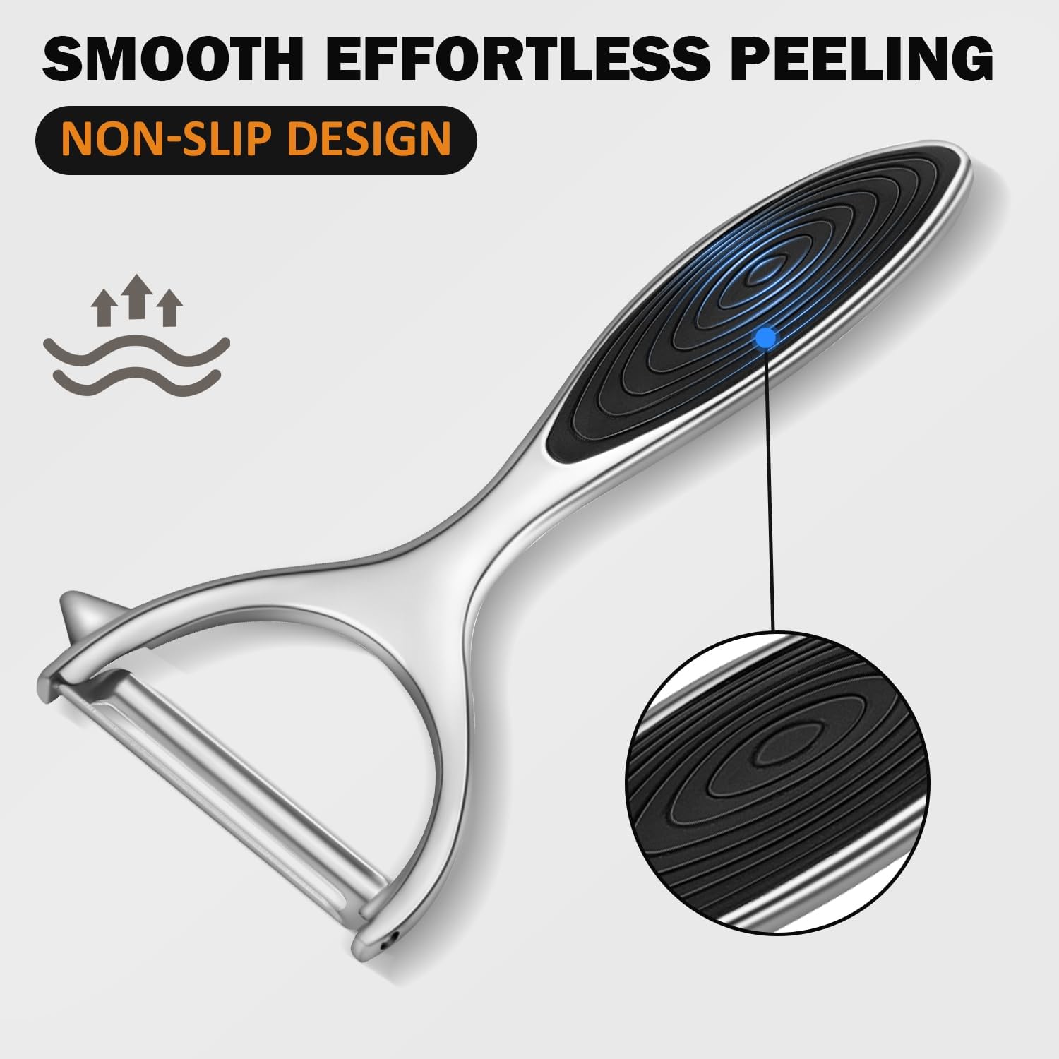 - Ergonomic Design and Non-slip: The rubber part will make the handle non-slip. Streamlined design allows for a smooth peeling process. Y-shape blade holder can stably control the peeler so that the blade is evenly stressed and the skin is removed smoothly.