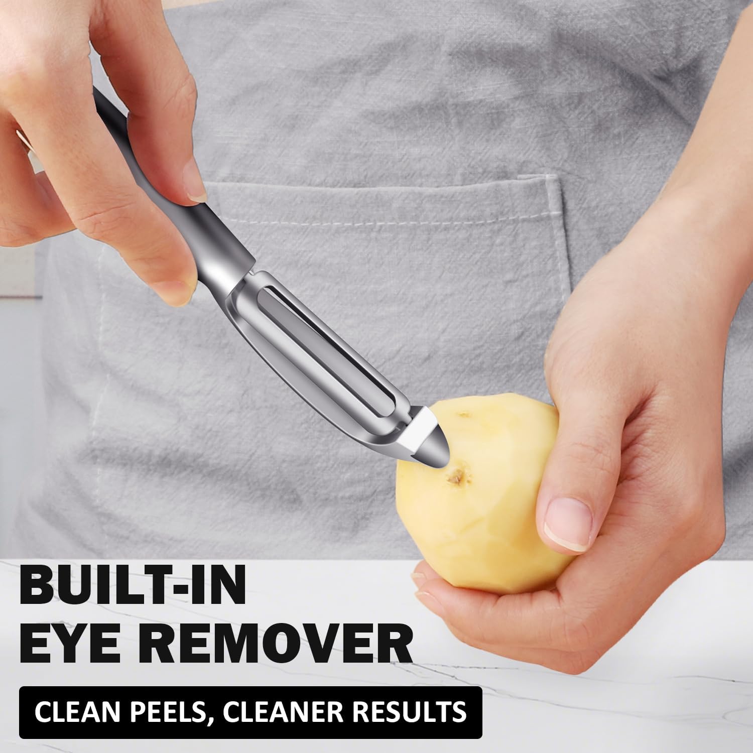 - Upgrade Quality Material: Use upgraded rust free carbon steel blade and zinc alloy body makes it rust-free. The blade is hard which better than ordinary stainless steel. Quickly removes tough skinned fruits and vegetables.