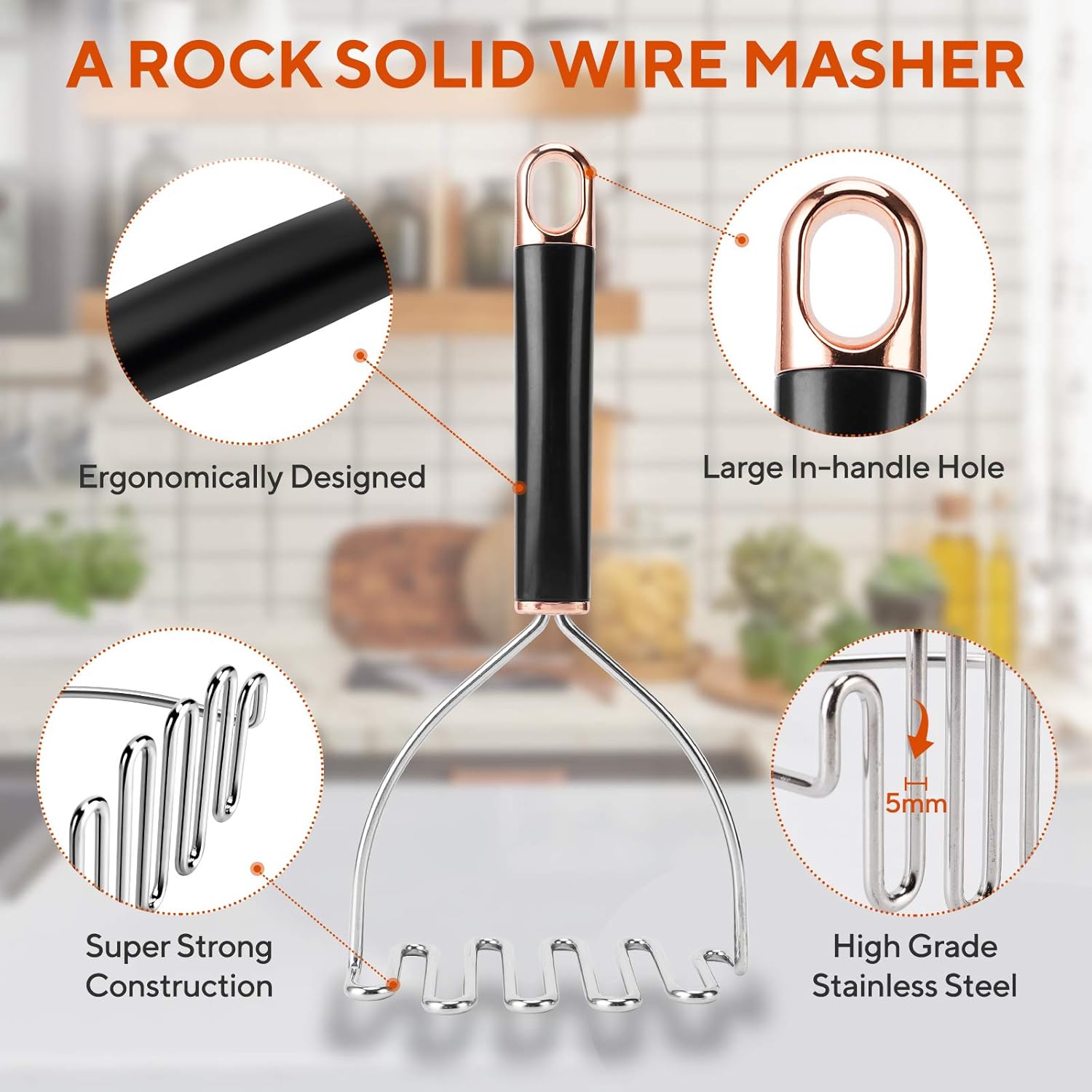 Potato Masher, Potato Masher Stainless Steel, Heavy Duty Mashed Potatoes Masher, Professional Metal Wire Masher Kitchen Tool for Bean, avocado, Vegetable-10.24 inch (Rose Gold)