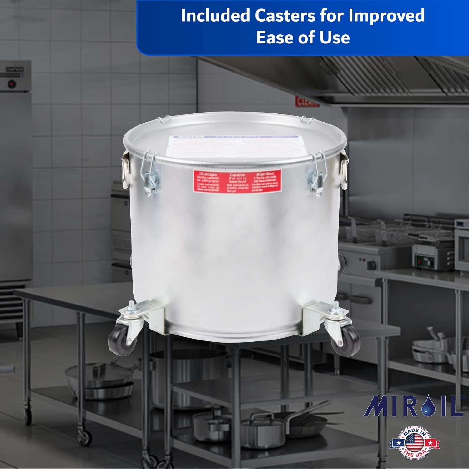 - HEAVY-DUTY STEEL OIL PAIL CADDY WITH CASTERS FOR EASY MOBILITY – The MirOil 40LC Oil Utility Pail is built with heavy-duty steel construction and a durable enameled exterior, making it a long-lasting solution for safely storing and transporting used cooking oil and food products. Designed for convenience, this oil disposal container features smooth-rolling casters for effortless maneuverability in busy kitchen environments. Its low-profile design fits easily under fryer drain valves, while the easy-to-clean surface.