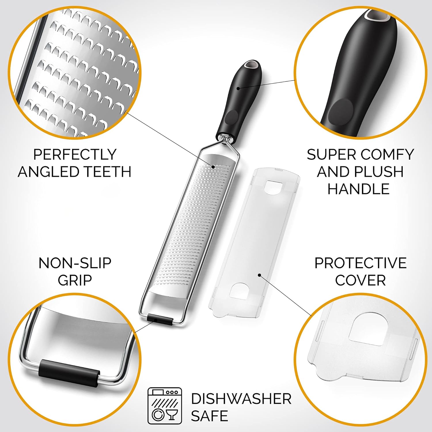 - IT DOES WHAT YOU WANT 👌 - Our zester grater is delicate enough to perfectly zest your lemons yet strong enough to plow through a block of aged parmesan cheese. Trust us - we spent two years fixating on the angle of micro teeth.
