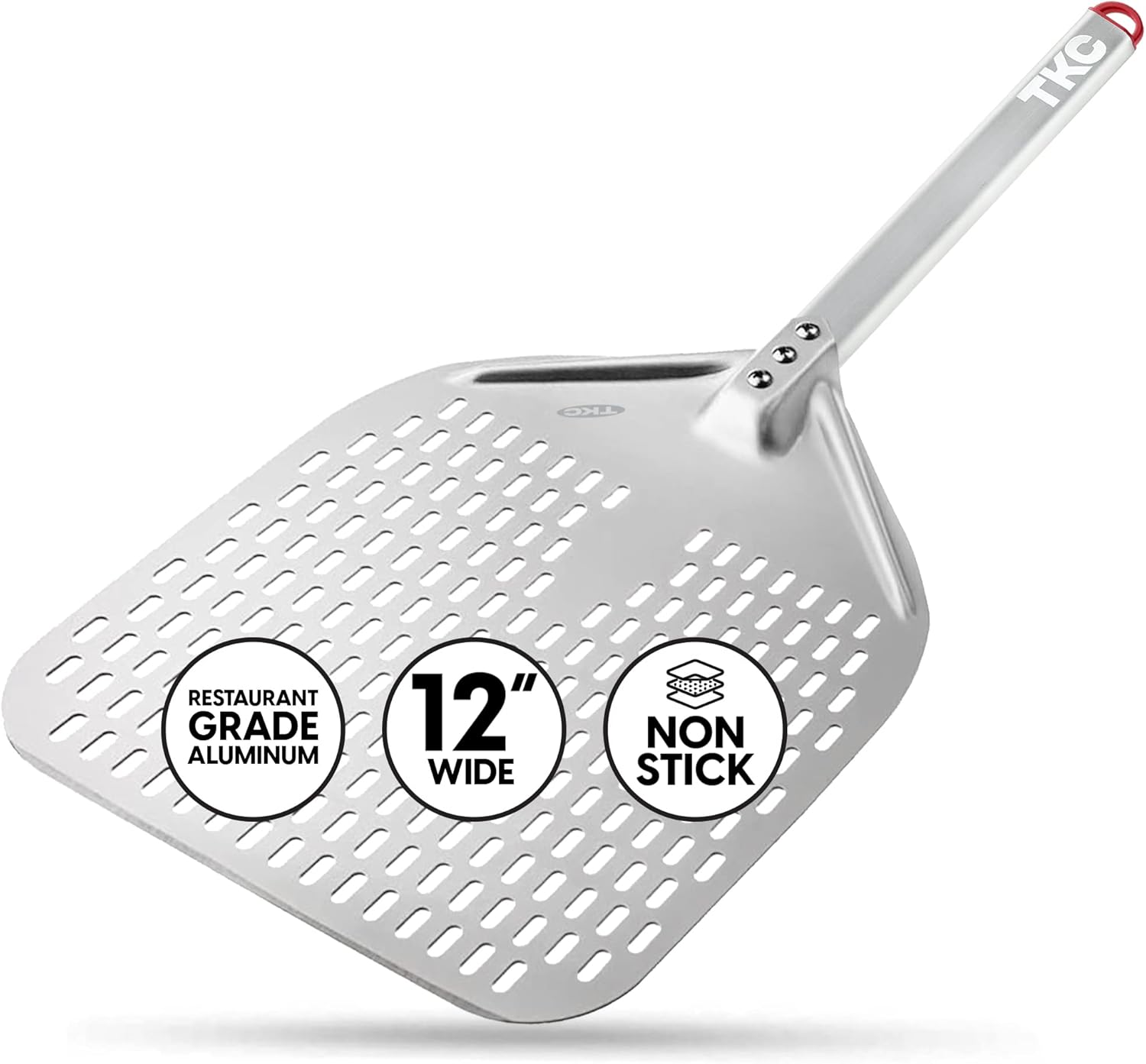 TKC Perforated Pizza Peel 12 Inch - Long Handle Perforated Aluminum Pizza Paddle - Lightweight Pizza Turning Peel Spatula - Compatible with all Ooni Pizza Ovens - 26 Inch Overall Length (Silver/Gray)