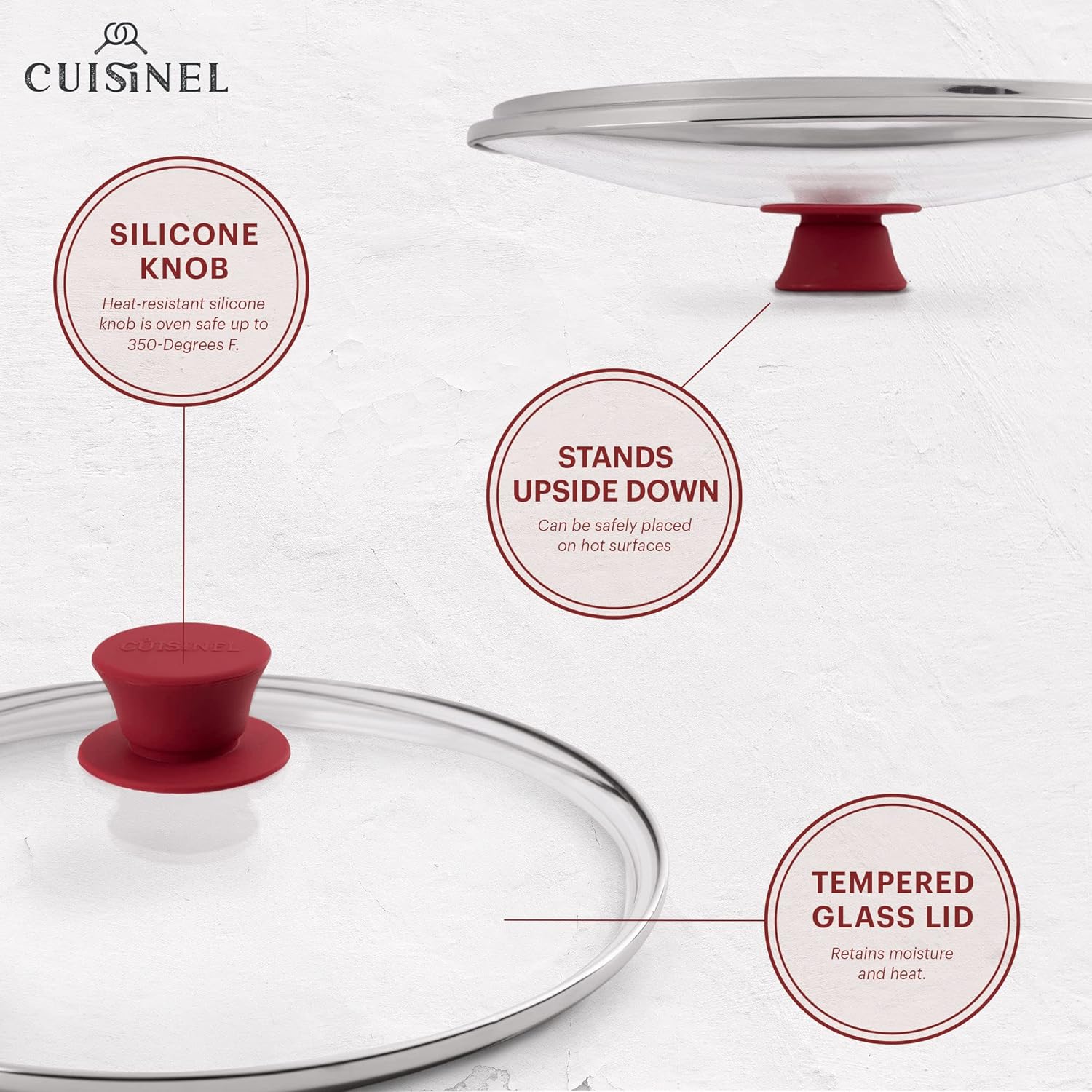 - COMFORTABLE, OVEN-SAFE RED SILICONE KNOB: Easy-grip silicone and Bakelit handle resists heat for quick cooling and comfortable non-slip grip. Flat top of knob allows you to stand the lid upside down, effectively eliminating dripping moisture off the lid. Rust-proof screw keeps lid secured to the knob. Keep heat, moisture, flavor and nutrients in your pan or pot at all times. Lid circulates heat and steam to more evenly cook delicious meals.