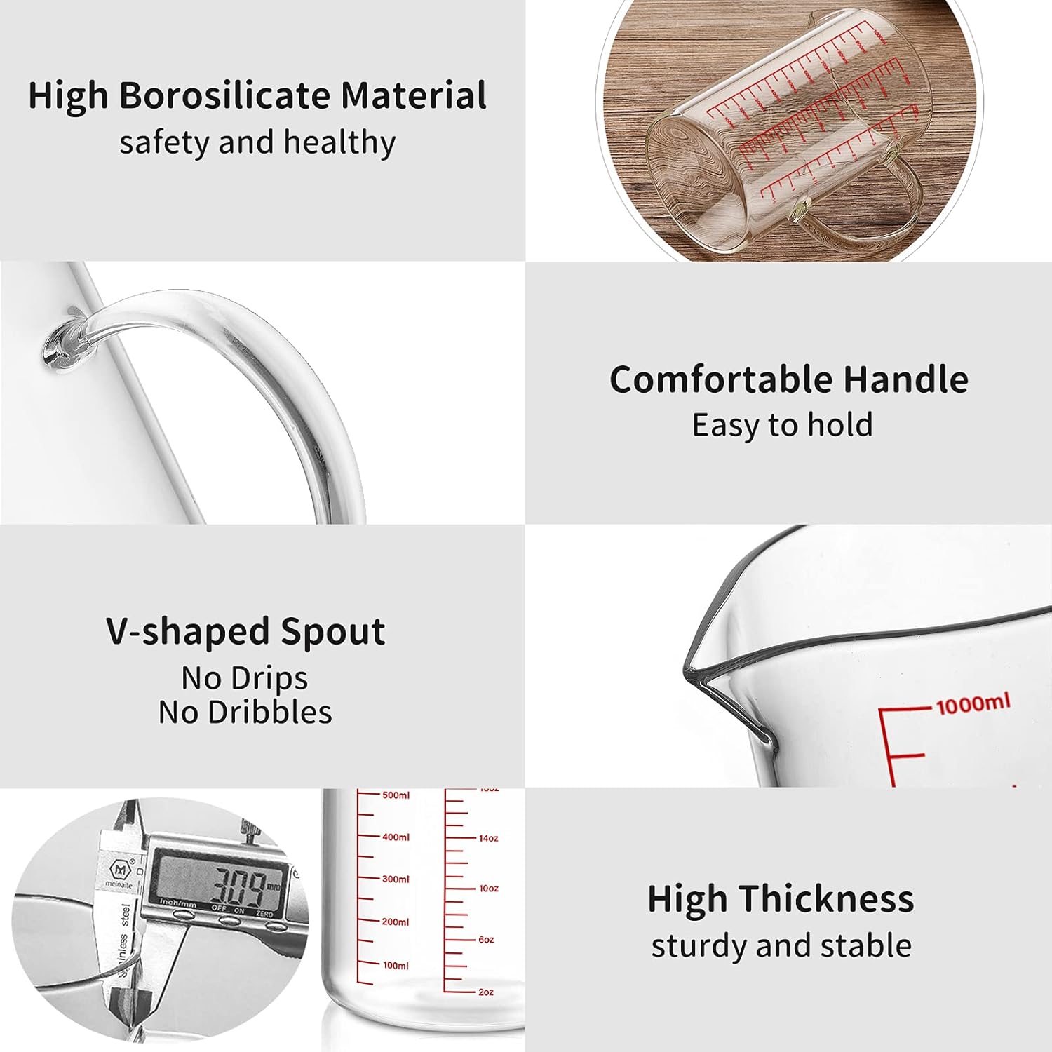 Luvan 34OZ/1000ML Glass Measuring Cup, 4 Cup Glass Measuring Cups With 3 Scales (Ml/Oz/Cup), High Borosilicate Measuring Cup With Handle and V-Shaped Spout, Dishwasher/Freezer/Microwave Safe